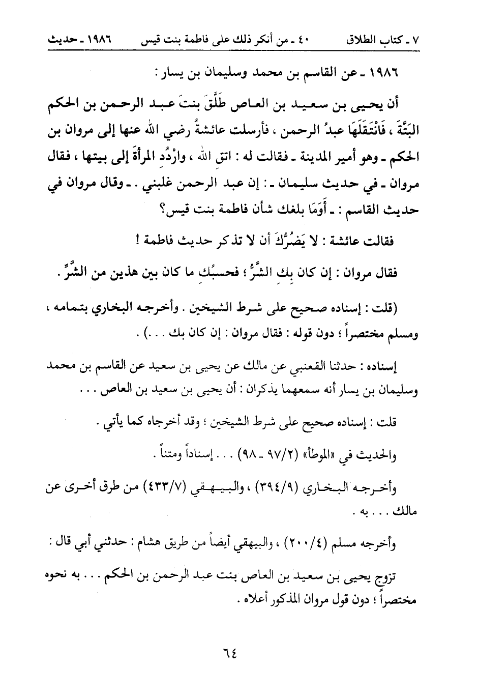 حديث القاسم:- أوَمَا بلغك شأن فاطمة بنت قيس؟