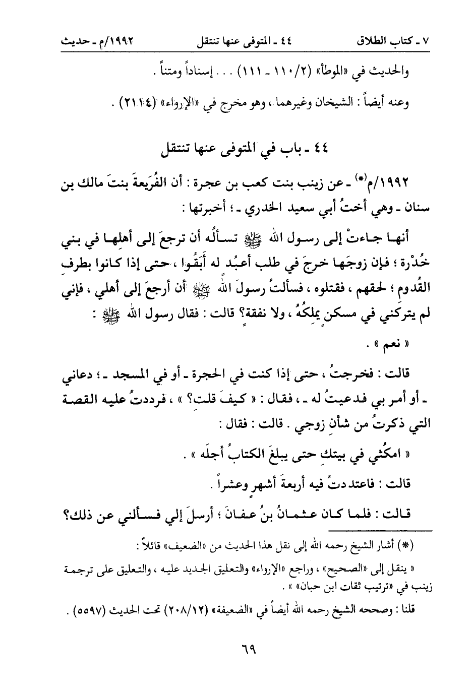 1992/م (*) - عن زينب بنت كعب بن عجرة: أن الفُرَيعةَ بنتَ مالك بن