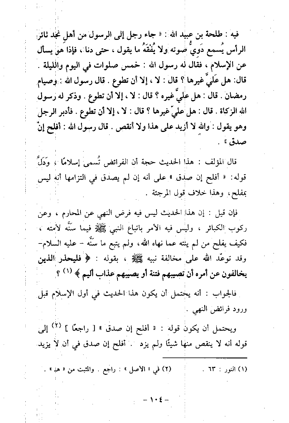 / 36 - فيه: طَلْحَةَ بْنَ عُبَيْدِ اللَّهِ، جَاءَ رَجُلٌ إِلَى الرَسُول (صلى الله عليه وسلم) مِنْ أَهْلِ نَجْدٍ، ثَائِرَ الرَّأْسِ، يُسْمَعُ دَوِىُّ صَوْتِهِ، وَلا يُفْقَهُ مَا يَقُولُ، حَتَّى دَنَا، فَإِذَا هُوَ يَسْأَلُ عَنِ الإسْلامِ، فَقَالَ له رَسُولُ اللَّهِ (صلى الله عليه وسلم) : تمت خَمْسُ صَلَوَاتٍ فِى الْيَوْمِ وَاللَّيْلَةِ -، فَقَالَ: هَلْ عَلَىَّ غَيْرُهَا؟ قَالَ: تمت لا، إِلا أَنْ تَطَوَّعَ -، قَالَ رَسُولُ اللَّهِ (صلى الله عليه وسلم) : تمت وَصِيَامُ رَمَضَانَ -، قَالَ: هَلْ عَلَىَّ غَيْرُهُ؟ قَالَ: تمت لا، إِلا أَنْ تَطَوَّعَ -، قَالَ: وَذَكَرَ لَهُ رَسُولُ اللَّهِ (صلى الله عليه وسلم) الزَّكَاةَ، قَالَ: هَلْ عَلَىَّ غَيْرُهَا؟ قَالَ: تمت لا، إِلا أَنْ تَطَوَّعَ -، قَالَ: فَأَدْبَرَ الرَّجُلُ، وَهُوَ يَقُولُ: وَاللَّهِ لا أَزِيدُ عَلَى هَذَا وَلا أَنْقُصُ، قَالَ رَسُولُ اللَّهِ (صلى الله عليه وسلم) : تمت أَفْلَحَ إِنْ صَدَقَ -. قال المؤلف: هذا الحديث حجة أن الفرائض تُسمى إسلامًا، ودل قوله: تمت أفلح إن صدق - على أنه إن لم يصدق فى التزامها أنه ليس بمفلح، وهذا خلاف قول المرجئة. فإن قيل: إن هذا الحديث ليس فيه فرض النهى عن المحارم، وعن ركوب الكبائر، وليس فيه الأمر باتباع النبى (صلى الله عليه وسلم) فيما سَنَّه لأمته، فكيف يفلح من لم ينته عما نهاه الله، ولم يتبع ما سَنَّه، (صلى الله عليه وسلم) ، وقد توعد الله على مخالفة نبيه (صلى الله عليه وسلم) ، بقوله: (فَلْيَحْذَرِ الَّذِينَ يُخَالِفُونَ عَنْ أَمْرِهِ أَن تُصِيبَهُمْ فِتْنَةٌ أَوْ يُصِيبَهُمْ عَذَابٌ أَلِيمٌ) [النور: 63] . فالجواب: أنه يحتمل أن يكون هذا الحديث فى أول الإسلام قبل ورود فرائض النهى. ويحتمل أن يكون قوله: تمت أفلح إن صدق - راجعًا إلى قوله: أنه لا ينقص منها شيئًا ولم يزد، أفلح إن صدق فى أن لا يزيد