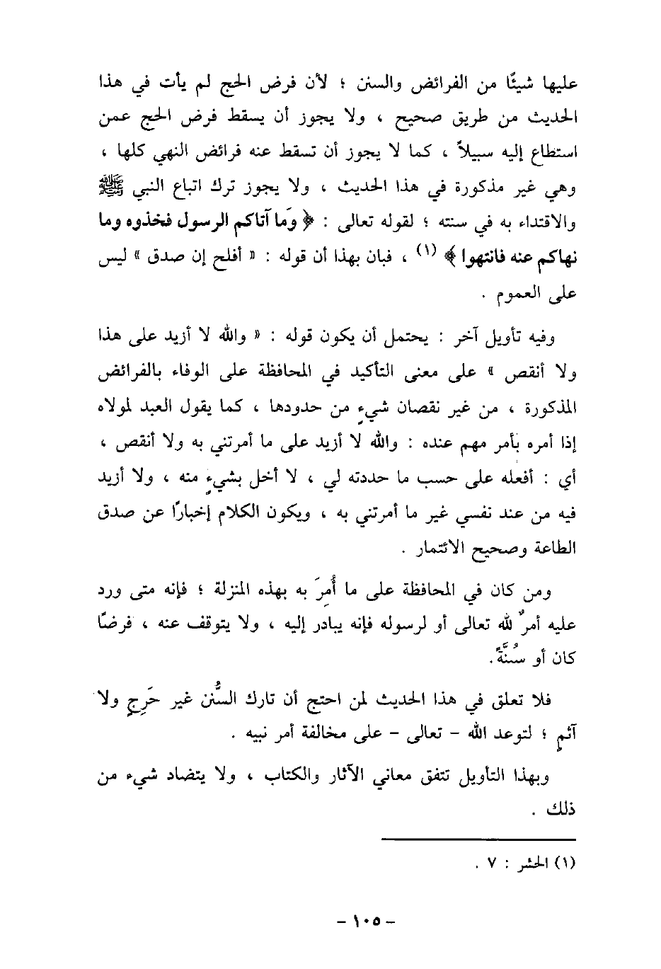 عليها شيئًا من الفرائض والسنن، ولا فرض الحج لم يأت فى هذا الحديث من طريق صحيح، ولا يجوز أن يسقط فرض الحج عمن استطاع إليه سبيلاً، كما لا يجوز أن تسقط عنه فرائض النهى كلها، وهى غير مذكورة فى هذا الحديث، ولا يجوز ترك اتباع النبى (صلى الله عليه وسلم) والاقتداء به فى سنته، لقوله تعالى: (وَمَا آتَاكُمُ الرَّسُولُ فَخُذُوهُ وَمَا نَهَاكُمْ عَنْهُ فَانتَهُوا) [الحشر: 7] ، فبان بهذا أن قوله: تمت أفلح إن صدق - ليس على العموم. وفيه تأويل آخر: يحتمل أن يكون قوله: تمت والله لا أزيد على هذا ولا أنقص - على معنى التأكيد فى المحافظة على الوفاء بالفرائض المذكورة، من غير نقصان شىءٍ من حدودها، كما يقول العبد لمولاه إذا أمره بأمر مهم عنده: والله لا أزيد على ما أمرتنى به ولا أنقص، أى أفعله على حسب ما حددته لى، لا أخل بشىءٍ منه، ولا أزيد فيه من عند نفسى غير ما أمرتنى به، ويكون الكلام إخبارًا عن صدق الطاعة وصحيح الائتمار. ومن كان فى المحافظة على ما أُمِرَ به بهذه المنزلة، فإنه متى ورد عليه أمرٌ لله تعالى أو لرسوله فإنه يبادر إليه، ولا يتوقف عنه، فرضًا كان أو سُنَّةً. فلا تعلق فى هذا الحديث لمن احتج أن تارك السُّنن غير حَرِجٍ ولا آثمٍ، لتوعد الله تعالى على مخالفة أمر نبيه. وبهذا التأويل تتفق معانى الآثار والكتاب، ولا يتضاد شىء من ذلك.