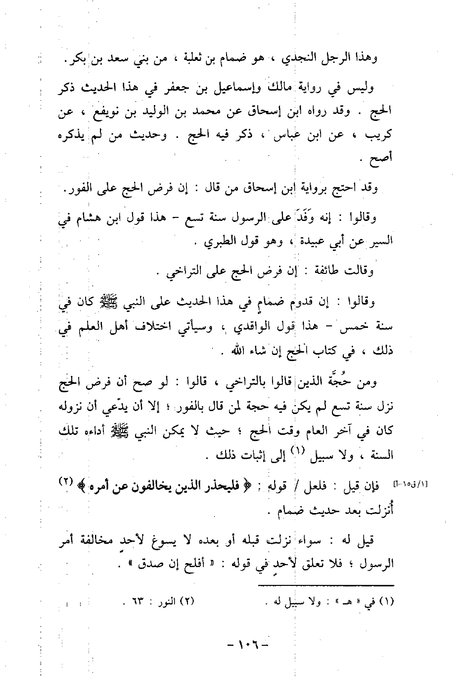 وهذا الرجل النجدى، هو ضمام بن ثعلبة، من بنى سعد بن بكر. وليس فى رواية مالك وإسماعيل بن جعفر فى هذا الحديث ذكر الحج، وقد رواه ابن إسحاق عن محمد بن الوليد بن نويفع، عن كريب، عن ابن عباس، ذكر فيه الحج. وحديث من لم يذكره أصح. وقد احتج برواية ابن إسحاق من قال: إن فرض الحج على الفور. وقالوا: إنه وفد على الرسول سنة تسع، هذا قول ابن هشام فى السير عن أبى عبيدة، وهو قول الطبرى. وقالت طائفة: إن فرض الحج على التراخى. وقالوا: إن قدوم ضمامٍ فى هذا الحديث على النبى (صلى الله عليه وسلم) كان فى سنة خمس، هذا قول الواقدى، وسيأتى اختلاف أهل العلم فى ذلك، فى كتاب الحج، إن شاء الله. ومن حُجَّة الذين قالوا بالتراخى، قالوا: لو صح أن فرض الحج نزل سنة تسع لم يكن فيه حجة لم قال بالفور، إلا أن يدعى أن نزوله كان فى آخر العام وقت الحج، حيث لا يمكن النبى (صلى الله عليه وسلم) أداءه تلك السنة، ولا سبيل إلى إثبات ذلك. فإن قيل: فلعل قوله: (فَلْيَحْذَرِ الَّذِينَ يُخَالِفُونَ عَنْ أَمْرِهِ) [النور: 63] أنزلت بعد حديث ضمام. قيل له: سواء نزلت قبله أو بعده لا يسوغ لأحدٍ مخالفة أمر الرسول، فلا تعلق لأحدٍ فى قوله: تمت أفلح إن صدق -.