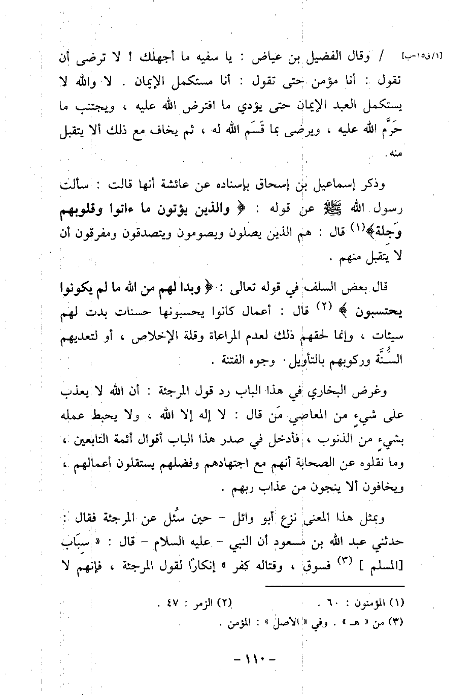 وقال الفضيل بن عياض: يا سفيه ما أجهلك، لا ترضى أن تقول: أنا مؤمن حتى تقول: أنا مستكمل الإيمان، لا والله، لا يستكمل العبد الإيمان حتى يؤدى ما افترض الله عليه، ويجتنب ما حرم الله عليه، ويرضى بما قسم الله له، ثم يخاف مع ذلك ألا يتقبل منه. وذكر إسماعيل بن إسحاق بإسناده عن عائشة، أنها قالت: سألت رسول الله (صلى الله عليه وسلم) عن قوله: (وَالَّذِينَ يُؤْتُونَ مَا آتَوا وَّقُلُوبُهُمْ وَجِلَةٌ) [المؤمنون: 60] قال: تمت هم الذين يصلون ويصومون ويتصدقون ومفرقون أن لا يتقبل منهم -. قال بعض السلف فى قوله تعالى: (وَبَدَا لَهُم مِّنَ اللَّهِ مَا لَمْ يَكُونُوا يَحْتَسِبُونَ) [الزمر: 47] قال: أعمال كانوا يحسبونها حسنات بدت لهم سيئات، وإنما لحقهم ذلك لعدم المراعاة وقلة الإخلاص، أو لتعديهم السُّنَّة وركوبهم بالتأويل وجوه الفتنة. وغرض البخارى فى هذا الباب رد قول المرجئة: أن الله لا يعذب على شىء من المعاصى من قال: لا إله إلا الله، ولا يحبط عمله بشىءٍ من الذنوب، فأدخل فى صدر الباب هذا أقوال أئمة التابعين، وما نقلوه عن الصحابة أنهم مع اجتهادهم وفضلهم يستقلون أعمالهم، ويخافون ألا ينجون من عذاب ربهم. وبمثل هذا المعنى نزع أبو وائل، حين سُئل عن المرجئة، فقال: حدثنى عبد الله بن مسعود، أن النبى (صلى الله عليه وسلم) ، قال: تمت سباب المسلم فسوق، وقتاله كفر -، إنكارًا لقول المرجئة، فإنهم لا