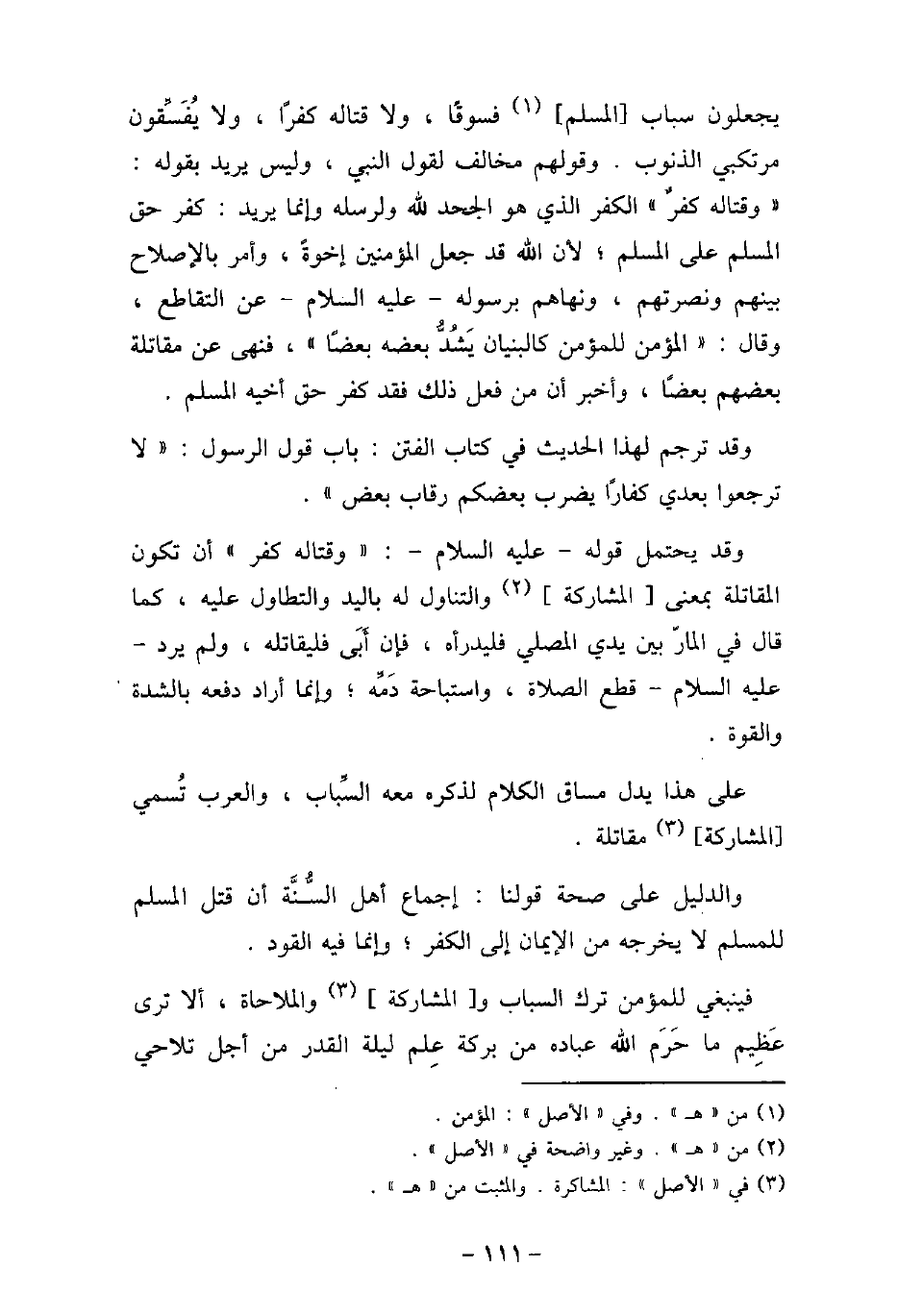 يجعلون سباب المسلم فسوقًا، ولا قتاله كفرًا، ولا يُفسقون مرتكبى الذنوب، وقولهم مخالف لقول النبى، وليس يريد بقوله: تمت وقتاله كفرٌ - الكفر الذى هو الجحد لله ولرسله، وإنما يريد كفر حق المسلم على المسلم، لأن الله قد جعل المؤمنين إخوةً، وأمر بالإصلاح بينهم ونصرتهم، ونهاهم برسوله، (صلى الله عليه وسلم) ، عن التقاطع، وقال: تمت المؤمن للمؤمن كالبنيان يَشُدُّ بعضه بعضًا -، فنهى عن مقاتلة بعضهم بعضًا، وأخبر أن من فعل ذلك، فقد كفر حق أخيه المسلم. وقد ترجم لهذا الحديث فى كتاب الفتن، باب قول الرسول: تمت لا ترجعوا بعدى كفارًا يضرب بعضكم رقاب بعض -. وقد يحتمل قوله (صلى الله عليه وسلم) : تمت وقتاله كفرٌ -، أن تكون المقاتلة بمعنى المشاركة والتناول له باليد والتطاول عليه، كما قال فى المار بين يدى المصلى: تمت فليدرأه، فإن أَبَى فليقاتله -، ولم يرد (صلى الله عليه وسلم) قطع الصلاة، واستباحة دَمِّه، وإنما أراد دفعه بالشدة والقوة. على هذا يدل مساق الكلام لذكره معه السباب، والعرب تُسمى المشاركة مقاتلة. والدليل على صحة قولنا: إجماع أهل السُّنَّة أن قتل المسلم للمسلم لا يخرجه من الإيمان إلى الكفر، وإنما فيه القود. فينبغى للمؤمن ترك السباب والمشاركة والملاحاة، ألا ترى عظيم ما حَرَم الله عباده من بركة علم ليلة القدر من أجل تلاحى