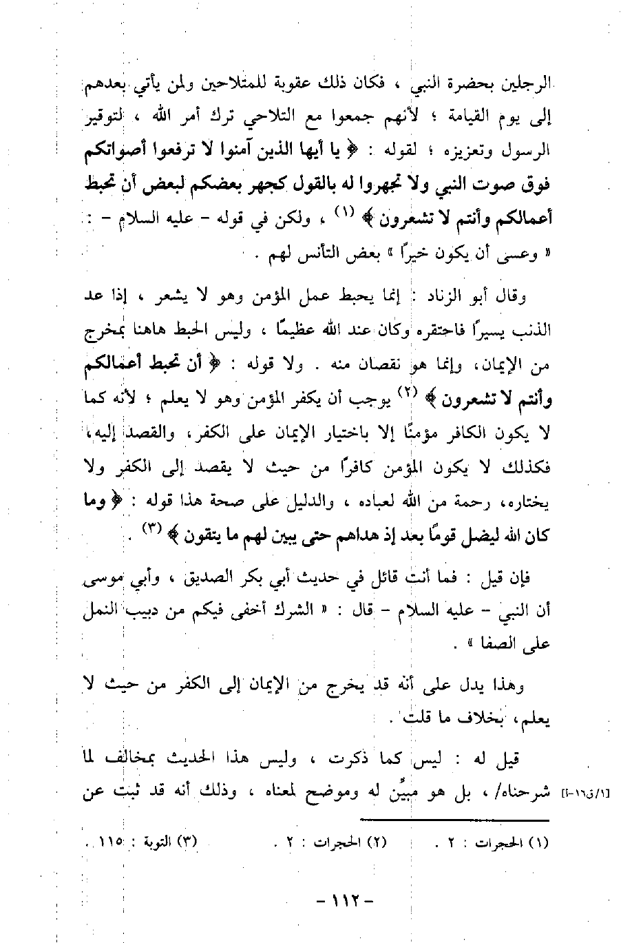 الرجلين بحضرة النبى، فكان ذلك عقوبة للمتلاحين ولمن يأتى بعدهم إلى يوم القيامة، لأنهم جمعوا مع التلاحى ترك أمر الله، لتوقير الرسول وتعزيزه، لقوله: (يَا أَيُّهَا الَّذِينَ آمَنُوا لاَ تَرْفَعُوا أَصْوَاتَكُمْ فَوْقَ صَوْتِ النَّبِىِّ وَلاَ تَجْهَرُوا لَهُ بِالْقَوْلِ كَجَهْرِ بَعْضِكُمْ لِبَعْضٍ أَن تَحْبَطَ أَعْمَالُكُمْ وَأَنتُمْ لاَ تَشْعُرُونَ) [الحجرات: 2] ، ولكن قوله (صلى الله عليه وسلم) : تمت وعسى أن يكون خيرًا - بعض التأنس لهم. وقال أبو الزناد: إنما يحبط عمل المؤمن وهو لا يشعر، إذا عد الذنب يسيرًا فاحتقره وكان عند الله عظيمًا، وليس الحبط هاهنا بمخرج من الإيمان، وإنما هو نقصان منه، ولا قوله: (أَن تَحْبَطَ أَعْمَالُكُمْ وَأَنتُمْ لاَ تَشْعُرُونَ (يوجب أن يكفر المؤمن وهو لا يعلم، لأنه كما لا يكون الكافر مؤمنًا إلا باختيار الإيمان على الكفر، والقصد إليه، فكذلك لا يكون المؤمن كافرًا من حيث لا يقصد إلى الكفر ولا يختاره، رحمة من الله لعباده، والدليل على صحة هذا قوله: (وَمَا كَانَ اللهُ لِيُضِلَّ قَوْمًا بَعْدَ إِذْ هَدَاهُمْ حَتَّى يُبَيِّنَ لَهُم مَّا يَتَّقُونَ) [التوبة: 115] . فإن قيل: فما أنت قائل فى حديث أبى بكر الصديق، وأبى موسى أن النبى، (صلى الله عليه وسلم) ، قال: تمت الشرك أخفى فيكم من دبيب النمل على الصفا -. وهذا يدل على أنه قد يخرج من الإيمان إلى الكفر من حيث لا يعلم، بخلاف ما قلت. قيل له: ليس كما ذكرت، وليس هذا الحديث بمخالف لما شرحناه، بل هو مبيِّن له وموضح لمعناه، وذلك أنه قد ثبت عن