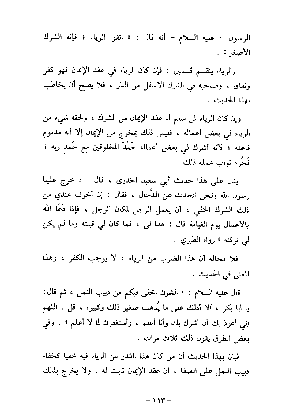 الرسول، (صلى الله عليه وسلم) ، أنه قال: تمت اتقوا الرياء، فإنه الشرك الأصغر -. والرياء ينقسم قسمين: فإن كان الرياء فى عقد الإيمان فهو كفر ونفاق، وصاحبه فى الدرك الأسفل من النار، فلا يصح أن يخاطب بهذا الحديث. وإن كان الرياء لمن سلم له عقد الإيمان من الشرك، ولحقه شىء من الرياء فى بعض أعماله، فليس ذلك بمخرج من الإيمان إلا أنه مذموم فاعله، لأنه أشرك فى بعض أعماله حَمْدَ المخلوقين مع حَمْدِ ربه، فَحُرم ثواب عمله ذلك. يدل على هذا حديث أبى سعيد الخدرى، قال: تمت خرج علينا رسول الله ونحن نتحدث عن الدَّجال، فقال: إن أخوف عندى من ذلك الشرك الخفى، أن يعمل الرجل لمكان الرجل، فإذا دَعَا الله بالأعمال يوم القيامة، قال: هذا لى، فما كان لى قبلته، وما لم يكن لى تركته -، رواه الطبرى. فلا محالة أن هذا الضرب من الرياء، لا يوجب الكفر، وهذا المعنى فى الحديث. قال (صلى الله عليه وسلم) : تمت الشرك أخفى فيكم من دبيب النمل -، ثم قال: تمت يا أبا بكر، ألا أدلك على ما يُذهب صغير ذلك وكبيره، قل: اللهم إنى أعوذ بك أن أشرك بك وأنا أعلم، وأستغفرك لما لا أعلم -. وفى بعض الطرق يقول ذلك ثلاث مرات. فبان بهذا الحديث أن من كان هذا القدر من الرياء فيه خفيًا كخفاء دبيب النمل على الصفا، أن عقد الإيمان ثابت له، ولا يخرج بذلك