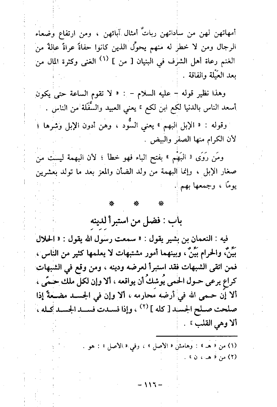 / 42 - فيه: النُّعْمَانَ بْنَ بَشِيرٍ يَقُولُ: سَمِعْتُ رَسُولَ اللَّهِ (صلى الله عليه وسلم) يَقُولُ: تمت الْحَلالُ بَيِّنٌ، وَالْحَرَامُ بَيِّنٌ، وَبَيْنَهُمَا أُمورٌ مُشْتَبَّهَاتٌ لا يَعْلَمُهَا كَثِيرٌ مِنَ النَّاسِ، فَمَنِ اتَّقَى الشُّبُهَاتِ فَقَدْ اسْتَبْرَأَ لِعِرْضِهِ وَدِينِهِ، وَمَنْ وَقَعَ فِى الشُّبُهَاتِ كَرَاعٍ يَرْعَى حَوْلَ الْحِمَى، يُوشِكُ أَنْ يُوَاقِعَهُ، أَلا وَإِنَّ لِكُلِّ مَلِكٍ حِمًى، أَلا إِنَّ حِمَى اللَّهِ فِى أَرْضِهِ مَحَارِمُهُ، أَلا وَإِنَّ فِى الْجَسَدِ مُضْغَةً إِذَا صَلَحَتْ صَلَحَ الْجَسَدُ كُلُّهُ، وَإِذَا فَسَدَتْ فَسَدَ الْجَسَدُ كُلُّهُ، أَلا وَهِىَ الْقَلْبُ -.
