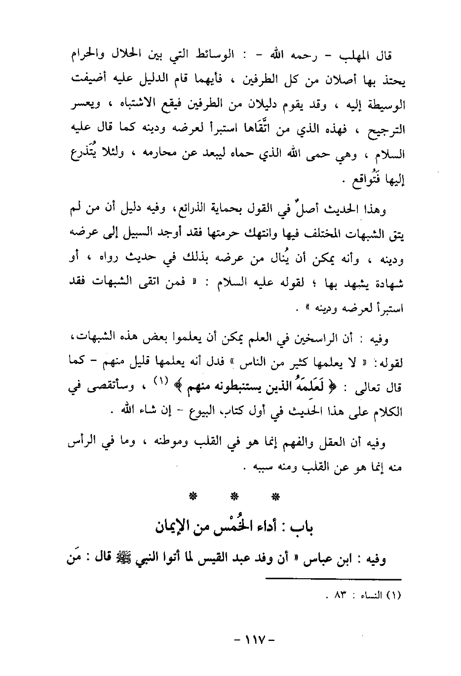 قال المهلب، رحمه الله: الوسائط التى بين الحلال والحرام يحتذ بها أصلان من كل الطرفين، فأيهما قام الدليل عليه أضيفت الوسيطة إليه، وقد يقوم دليلان من الطرفين فيقع الاشتباه، ويعسر الترجيح، فهذه الذى من اتَّقَاها استبرأ لعرضه ودينه كما قال (صلى الله عليه وسلم) ، وهى حمى الله الذى حماه ليبعد عن محارمه، ولئلا يُتَذرع إليها فَتُواقع. وهذا الحديث أصلٌ فى القول بحماية الذرائع، وفيه دليل أن من لم يتق الشبهات المختلف فيها وانتهك حرمتها فقد أوجد السبيل إلى عرضه ودينه، وأنه يمكن أن يُنال من عرضه بذلك فى حديث رواه، أو شهادة يشهد بها، لقوله (صلى الله عليه وسلم) : تمت فمن اتقى الشبهات فقد استبرأ لعرضه ودينه -. وفيه: أن الراسخين فى العلم يمكن أن يعلموا بعض هذه الشبهات لقوله: تمت لا يعلمها كثير من الناس - فدل أنه يعلمها قليل منهم، كما قال تعالى: (لَعَلِمَهُ الَّذِينَ يَسْتَنبِطُونَهُ مِنْهُمْ) [النساء: 83] ، وسأتقصى فى الكلام على هذا الحديث فى أول كتاب البيوع، إن شاء الله. وفيه: أن العقل والفهم إنما هو فى القلب وموطنه، وما فى الرأس منه إنما هو عن القلب ومنه سببه.