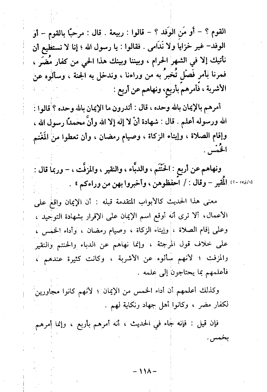 الْقَوْمُ، أَوْ مَنِ الْوَفْدُ -؟ قَالُوا: رَبِيعَةُ، قَالَ: تمت مَرْحَبًا بِالْقَوْمِ أَوْ بِالْوَفْدِ، غَيْرَ خَزَايَا وَلا نَدَامَى -، فَقَالُوا: يَا رَسُولَ اللَّهِ، إِنَّا لا نَسْتَطِيعُ أَنْ نَأْتِيكَ إِلا فِى الشَّهْرِ الْحَرَامِ، وَبَيْنَنَا وَبَيْنَكَ هَذَا الْحَىُّ مِنْ كُفَّارِ مُضَرَ، فَمُرْنَا بِأَمْرٍ فَصْلٍ، نُخْبِرْ بِهِ مَنْ وَرَاءَنَا، وَنَدْخُلْ بِهِ الْجَنَّة، َ وَسَأَلُوهُ عَنِ الأشْرِبَةِ، فَأَمَرَهُمْ بِأَرْبَعٍ، وَنَهَاهُمْ عَنْ أَرْبَعٍ: أَمَرَهُمْ بِالإيمَانِ بِاللَّهِ وَحْدَهُ، قَالَ: تمت أَتَدْرُونَ مَا الإيمَانُ بِاللَّهِ وَحْدَهُ -؟ قَالُوا: اللَّهُ وَرَسُولُهُ أَعْلَمُ، قَالَ: تمت شَهَادَةُ أَنْ لا إِلَهَ إِلا اللَّهُ وَأَنَّ مُحَمَّدًا رَسُولُ اللَّهِ، وَإِقَامُ الصَّلاةِ، وَإِيتَاءُ الزَّكَاةِ، وَصِيَامُ رَمَضَانَ، وَأَنْ تُعْطُوا مِنَ الْمَغْنَمِ الْخُمُسَ -، وَنَهَاهُمْ عَنْ أَرْبَعٍ: عَنِ الْحَنْتَمِ، وَالدُّبَّاءِ، وَالنَّقِيرِ، وَالْمُزَفَّتِ، وَرُبَّمَا قَالَ الْمُقَيَّرِ، وَقَالَ: تمت احْفَظُوهُنَّ، وَأَخْبِرُوا بِهِنَّ مَنْ وَرَاءَكُمْ -. معنى هذا الحديث كالأبواب المتقدمة قبله: أن الإيمان واقع على الأعمال، ألا ترى أنه أوقع اسم الإيمان على الإقرار بشهادة التوحيد، وعلى إقام الصلاة، وإيتاء الزكاة، وصيام رمضان، وأداء الخمس، على خلاف قول المرجئة، وإنما نهاهم عن الدباء والحنتم والنقير والمزفت، لأنه سألوه عن الأشربة، وكانت كثيرة عندهم، فأعلمهم بما يحتاجون إلى علمه. وكذلك أعلمهم أن أداء الخمس من الإيمان، لأنهم كانوا مجاورين لكفار مضر، وكانوا أهل جهاد ونكاية لهم. فإن قيل: فإنه جاء فى الحديث، أنه أمرهم بأربع، وإنما أمرهم بخمس.