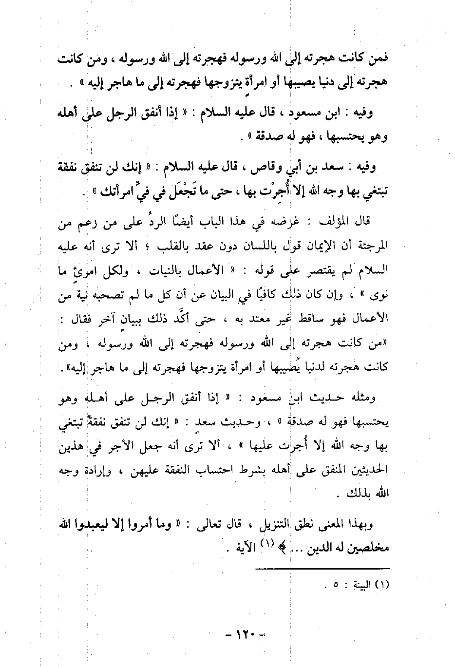 فَمَنْ كَانَتْ هِجْرَتُهُ إِلَى اللَّهِ وَرَسُولِهِ، فَهِجْرَتُهُ إِلَى اللَّهِ وَرَسُولِهِ، وَمَنْ كَانَتْ هِجْرَتُهُ لدُنْيَا يُصِيبُهَا، أَوِ امْرَأَةٍ يَتَزَوَّجُهَا، فَهِجْرَتُهُ إِلَى مَا هَاجَرَ إِلَيْهِ -. / 45 - وفيه: ابن مَسْعُود، قَالَ (صلى الله عليه وسلم) : تمت إِذَا أَنْفَقَ الرَّجُلُ عَلَى أَهْلِهِ وَهُوَ يَحْتَسِبُهَا، فَهُوَ لَهُ صَدَقَةٌ -. / 46 - وفيه: سَعْدِ بْنِ أَبِى وَقَّاصٍ، قَالَ (صلى الله عليه وسلم) : تمت إِنَّكَ لَنْ تُنْفِقَ نَفَقَةً تَبْتَغِى بِهَا وَجْهَ اللَّهِ، إِلا أُجِرْتَ عَلَيْهَا، حَتَّى مَا تَجْعَلُ فِى فَمِ امْرَأَتِكَ -. قال المؤلف: غرضه فى هذا الباب أيضًا الرد على من زعم من المرجئة أن الإيمان قول باللسان دون عقد بالقلب؛ ألا ترى أنه (صلى الله عليه وسلم) لم يقتصر على قوله: تمت الأعمال بالنيات، ولكل امرئٍ ما نوى -، وإن كان ذلك كافيًا فى البيان عن أن كل ما لم تصحبه نية من الأعمال فهو ساقط غير معتد به، حتى أكد ذلك ببيان آخر فقال: تمت من كانت هجرته إلى الله ورسوله فهجرته إلى الله ورسوله، ومن كانت هجرته لدنيا يصيبها أو امرأة يتزوجها فهجرته إلى ما هاجر إليه -. ومثله حديث ابن مسعود: تمت إذا أنفق الرجل على أهله وهو يحتسبها فهو له صدقة -. وحديث سعد: تمت إنك لن تنفق نفقة تبتغى بها وجه الله إلا أُجرت عليها -، ألا ترى أنه جعل الأجر فى هذين الحديثين المنفق على أهله بشرط احتساب النفقة عليهن، وإرادة وجه الله بذلك. وبهذا المعنى نطق التنزيل، قال تعالى: (وَمَا أُمِرُوا إِلاَّ لِيَعْبُدُوا اللَّهَ مُخْلِصِينَ لَهُ الدِّينَ) [البينة: 5] الآية.