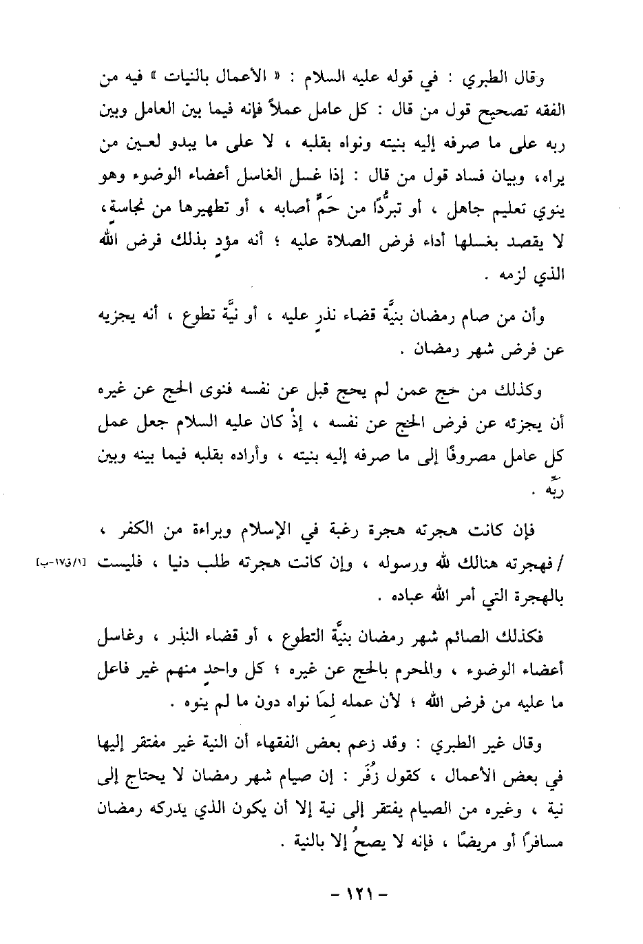 وقال الطبرى: فى قوله (صلى الله عليه وسلم) : تمت الأعمال بالنيات - فيه من الفقه تصحيح قول من قال: كل عامل عملاً، فإنه بين العامل وبين ربه على ما صرفه إليه بنيته ونواه بقلبه، لا على ما يبدو لعين من يراه، وبيان فساد قول من قال: إذا غسل الغاسل أعضاء الوضوء وهو ينوى تعليم جاهل، أو تبرُّدًا من حَمٍّ أصابه، أو تطهيرها من نجاسة، لا يقصد بغسلها أداء فرض الصلاة عليه، أنه مؤدٍ بذلك فرض الله الذى لزمه. وأن من صام رمضان بنية قضاء نذرٍ عليه، أو نية تطوع، أنه يجزيه عن فرض شهر رمضان. وكذلك من حج عمن لم يحج قبل عن نفسه، فنوى الحج عن غيره أن يجزئه عن فرض الحج عن نفسه، إذ كان (صلى الله عليه وسلم) جعل عمل كل عامل مصروفًا إلى ما صرفه إليه بنيته، وأراده بقلبه فيما بين وبين ربه. فإن كانت هجرته هجرة رغبة فى الإسلام وبراءة من الكفر، فهجرته هنالك لله ورسوله، وإن كانت هجرته طلب دنيا، فليست بالهجرة التى أمر الله عباده. فكذلك الصائم شهر رمضان بنية التطوع، أو قضاء النذر، وغاسل أعضاء الوضوء، والمحرم بالحج عن غيره، كل واحدٍ منهم غير فاعل ما عليه من فرض الله، لأن عمله لِمَا نواه دون ما لم ينوه. وقال غير الطبرى: وقد زعم بعض الفقهاء أن النية غير مفتقر إليها فى بعض الأعمال، كقول زُفَر: إن صيام شهر رمضان لا يحتاج إلى نية، وغيره من الصيام يفتقر إلى نية إلا أن يكون الذى يدركه رمضان مسافرًا أو مريضًا، فإنه لا يصحُ إلا بالنية.