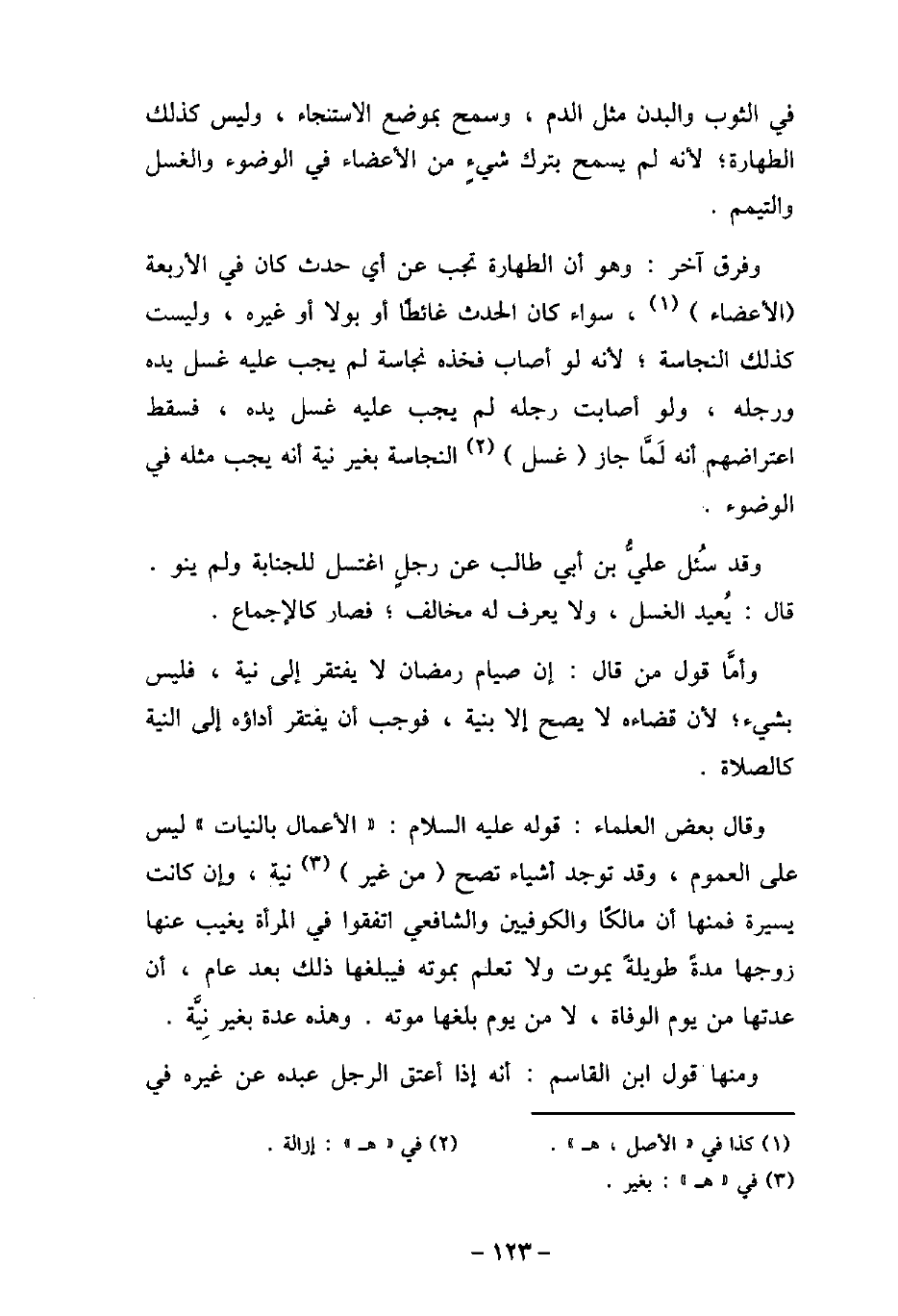 فى الثوب والبدن مثل الدم، وسمح بموضع الاستنجاء، وليس كذلك الطهارة، لأنه لم يسمح بترك شىء من الأعضاء فى الوضوء والغسل والتيمم. وفرق آخر: وهو أن الطهارة تجب عن أى حدث كان فى الأربعة الأعضاء، سواء كان الحدث غائطًا أو بولا أو غيره، وليست كذلك النجاسة، لأنه لو أصاب فخذه نجاسة لم يجب عليه غسل يده ورجله، ولو أصابت رجله لم يجب عليه غسل يده، فسقط اعتراضهم أنه لما جاز غسل النجاسة بغير نية أنه يجب مثله فى الوضوء. وقد سئل علىُّ بن أبى طالب عن رجل اغتسل للجنابة ولم ينو، قال: يعيد الغسل، ولا يعرف له مخالف، فصار كالإجماع. وأما قول من قال: إن صيام رمضان لا يفتقر إلى نية، فليس بشىء، لأن قضاءه لا يصح إلا بنية، فوجب أن يفتقر أداؤه إلى النية كالصلاة. وقال بعض العلماء: قوله (صلى الله عليه وسلم) : تمت الأعمال بالنيات - ليس على العموم، وقد توجد أشياء تصح من غير نية، وإن كانت يسيرة فمنها أن مالكًا والكوفيين والشافعى اتفقوا فى المرأة يغيب عنها زوجها مدة طويلة بموت ولا تعلم بموته فيبلغها ذلك بعد عام، أن عدتها من يوم الوفاة، لا من يوم بلغها موته، وهذه عدة بغير نية. ومنها قول ابن القاسم: أنه إذا أعتق الرجل عبده عن غيره فى