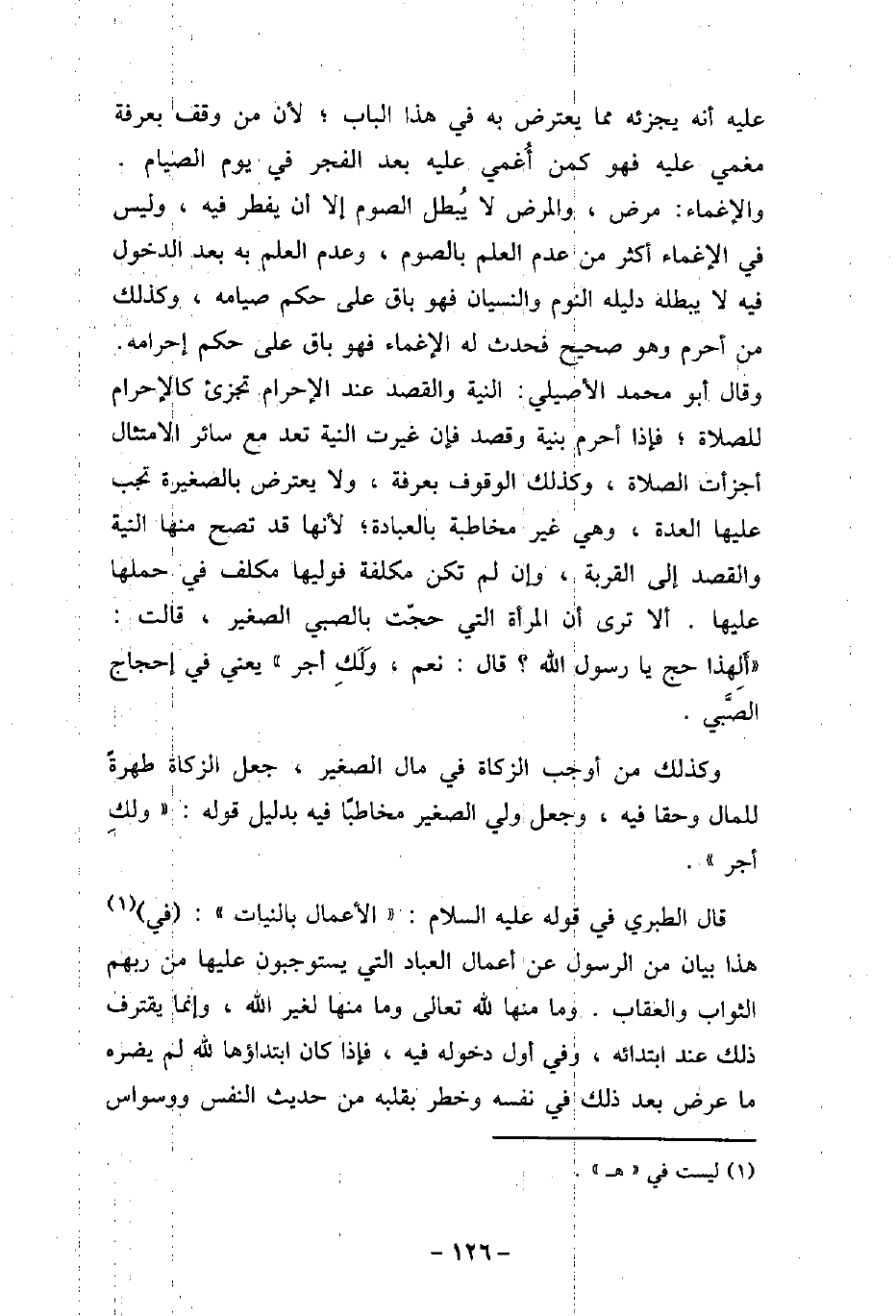 عليه أنه يجزئه مما يعترض به فى هذا الباب، لأن من وقف بعرفة مغمى عليه فهو كمن أغمى عليه بعد الفجر فى يوم الصيام والإغماء: مرض، والمرض لا يبطل الصوم إلا أن يفطر فيه، وليس فى الإغماء أكثر من عدم العلم بالصوم، وعدم العلم به بعد الدخول فيه لا يبطله دليله النوم والنسيان فهو باق على حكم صيامه، وكذلك من أحرم وهو صحيح فحدث له الإغماء فهو باق على حكم إحرامه. وقال أبو محمد الأصيلى: النية والقصد عند الإحرام تجزئ كالإحرام للصلاة، فإذا أحرم بنية وقصد فإن غيرت النية تعد مع سائر الامتثال أجزأت الصلاة، وكذلك الوقوف بعرفة، ولا يعترض بالصغيرة تجب عليها العدة، وهى غير مخاطبة بالعبادة، لأنها قد تصح منها النية والقصد إلى القربة، وإن لم تكن مكلفة فوليها مكلف فى حملها عليها، ألا ترى أن المرأة التى حجت بالصبى الصغير، قالت: تمت ألهذا حج يا رسول الله؟ قال: نعم، ولك أجر - يعنى فى إحجاج الصبى. وكذلك من أوجب الزكاة فى مال الصغير، جعل الزكاة طهرة للمال وحقا فيه، وجعل ولى الصغير مخاطبًا فيه بدليل قوله: تمت ولك أجر -. قال الطبرى فى قوله (صلى الله عليه وسلم) : تمت الأعمال بالنيات -: فى هذا بيان من الرسول عن أعمال العباد التى يستوجبون عليها من ربهم الثواب والعقاب، وما منها لله تعالى وما منها لغير الله، وإنما يقترف ذلك عند ابتدائه، وفى أول دخوله فيه، فإذا كان ابتداؤها لله لم يضره ما عرض بعد ذلك فى نفسه وخطر بقلبه من حديث النفس ووسواس