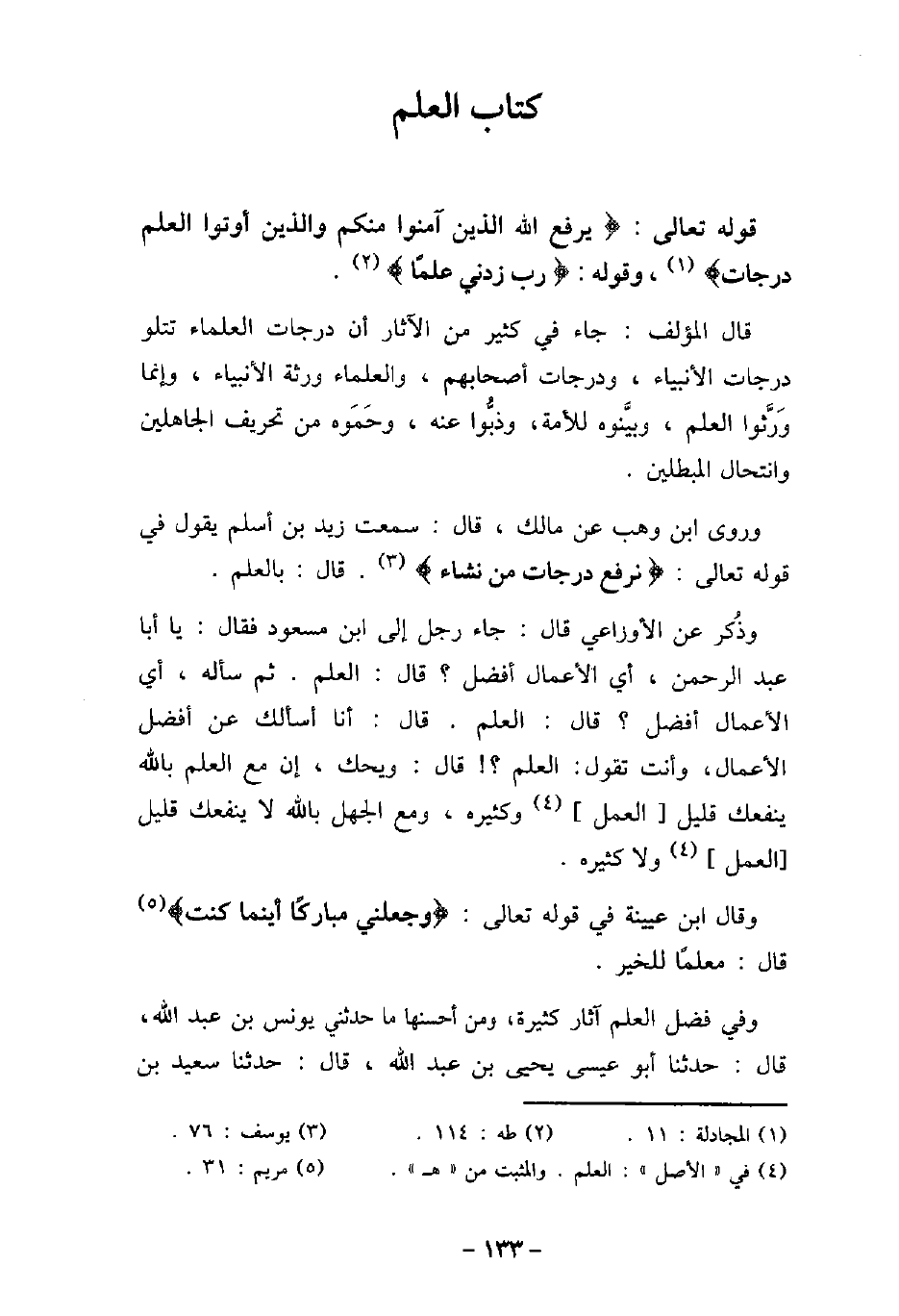 قَوْلِهِ تَعَالَى: (يَرْفَعِ اللَّهُ الَّذِينَ آمَنُوا مِنْكُمْ وَالَّذِينَ أُوتُوا الْعِلْمَ دَرَجَاتٍ) [المجادلة 11] وَقَوْلِهِ: (وَقُلْ رَبِّ زِدْنِي عِلْمًا) [طه 114] . قال المؤلف: جاء فى كثير من الآثار أن درجات العلماء تتلو درجات الأنبياء، ودرجات أصحابهم، والعلماء ورثة الأنبياء، وإنما ورثوا العلم وبينوه للأمة، وذبوا عنه، وحموه من تخريف الجاهلين وانتحال المبطلين. وروى ابن وهب، عن مالك، قال: سمعت زيد بن أسلم يقول فى قوله تعالى: (نَرْفَعُ دَرَجَاتٍ مِّن نَّشَاء) [يوسف: 76] ، قال: بالعلم. وذكر عن الأوزاعى قال: جاء رجل إلى ابن مسعود فقال: يا أبا عبد الرحمن، أى الأعمال أفضل؟ قال: العلم، ثم سأله أى الأعمال أفضل؟ قال: العلم، قال: أنا أسألك عن أفضل الأعمال، وأنت تقول: العلم؟ قال: ويحك، إن مع العلم بالله ينفعك قليل العمل وكثيره، ومع الجهل بالله لا ينفعك قليل العمل ولا كثيره. وقال ابن عيينة فى قوله تعالى: (وَجَعَلَنِى مُبَارَكًا أَيْنَ مَا كُنتُ) [مريم: 31] ، قال: معلمًا للخير. وفى فضل العلم آثار كثيرة، ومن أحسنها ما حدثنى يونس بن عبد الله، قال: حدثنا أبو عيسى يحيى بن عبد الله، قال: حدثنا سعيد بن