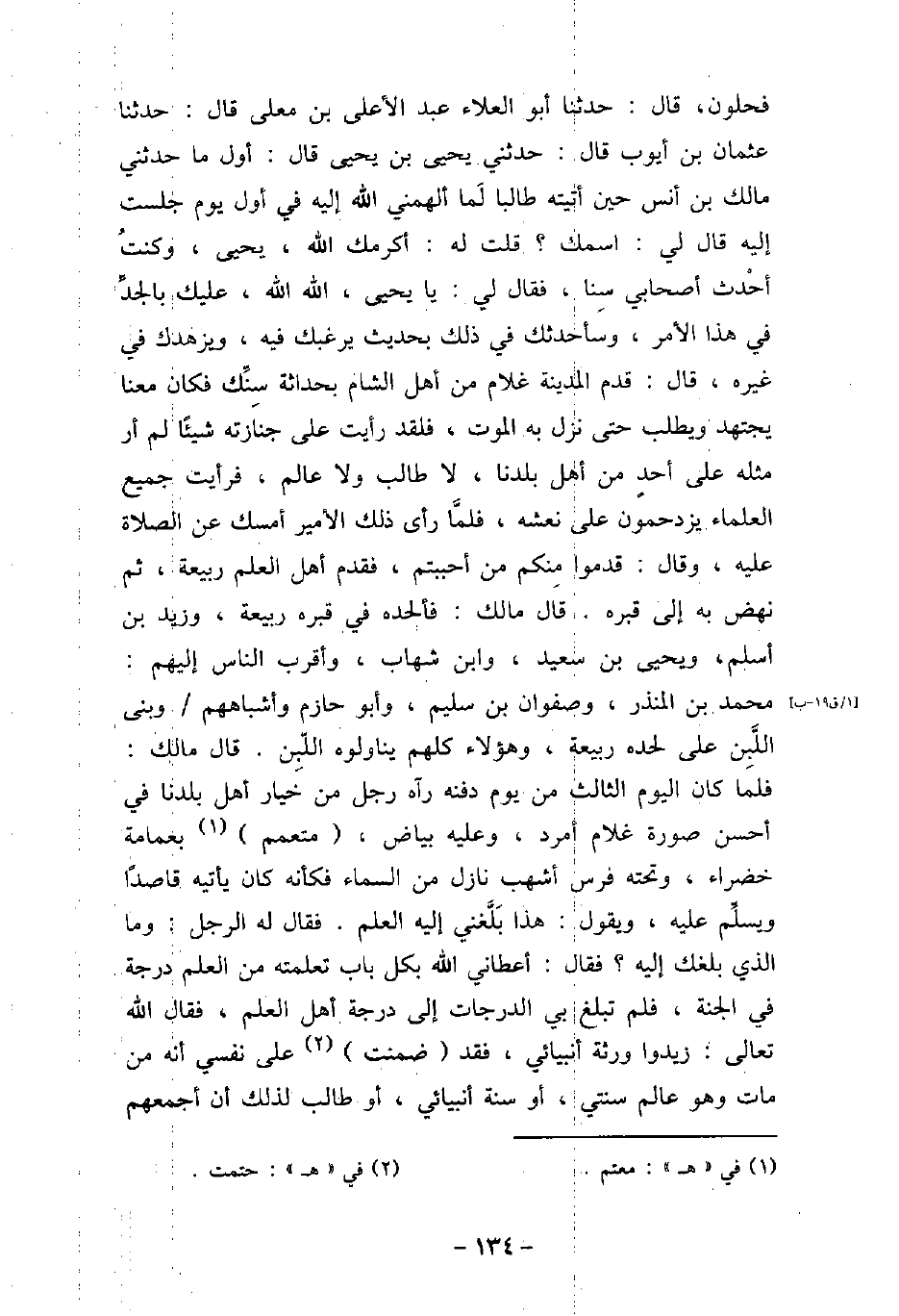 فحلون، قال: حدثنا أبو العلاء عبد الأعلى ابن معلى، قال: حدثنا عثمان بن أيوب، قال: حدثنى يحيى بن يحيى، قال: أول ما حدثنى مالك بن أنس حين أتيته طالبًا لما ألهمنى الله إليه فى أول يوم جلست إليه قال لى: اسمك؟ قلت له: أكرمك الله يحيى، وكنت أحدث أصحابى سنًا، فقال لى: يا يحيى، الله الله، عليك بالجدِّ فى هذا الأمر، وسأحدثك فى ذلك بحديث يرغبك فيه، ويرهدك فى غيره، قال: قدم المدينة غلام من أهل الشام بحداثة سنك فكان معنا يجتهد ويطلب حتى نزل به الموت، فلقد رأيت على جنازته شيئًا لم أر مثله على أحد من أهل بلدنا، لا طالب ولا عالم، فرأيت جميع العلماء يزدحمون على نعشه، فلما رأى ذلك الأمير أمسك عن الصلاة عليه، وقال: قدموا منكم من أحببتم، فقدم أهل العلم ربيعة، ثم نهض به إلى قبره، قال مالك: فألحده فى قبره ربيعة، وزيد بن أسلم، ويحيى بن سعيد، وابن شهاب، وأقرب الناس إليهم محمد بن المنذر، وصفون بن سليم، وأبو حازم وأشباههم وبنى اللَّبِن على لحده ربيعة، وهؤلاء كلهم يناولوه اللَّبِن، قال مالك: فلما كان اليوم الثالث من يوم دفنه رآه رجل من خيار أهل بلدنا فى أحسن صورة غلام أمرد، وعليه بياض، متعمم بعمامة خضراء، وتحته فرس أشهب نازل من السماء فكأنه كان يأتيه قاصدًا ويسلم عليه، ويقول: هذا بَلَّغنى إليه العلم، فقال له الرجل: وما الذى بلغك إليه؟ فقال: أعطانى الله بكل باب تعلمته من العلم درجة فى الجنة، فلم تبلغ بى الدرجات إلى درجة أهل العلم، فقال الله تعالى: زيدوا ورثة أنبيائى، فقد ضمنت على نفسى أنه من مات وهو عالم سنتى، أو سنة أنبيائى، أو طالب لذلك أن أجمعهم