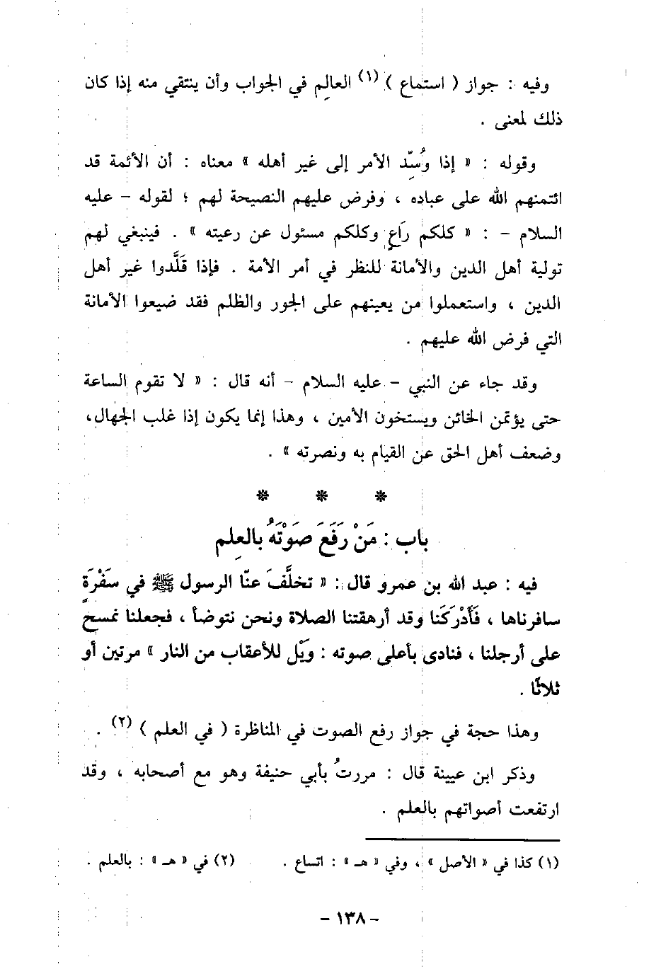 / 2 - فيه: عَبْدِاللَّهِ بْنِ عَمْرٍو، قَالَ: تَخَلَّفَ عَنَّا الرَسُولُ (صلى الله عليه وسلم) فِي سَفْرَةٍ سَافَرْنَاهَا، فَأَدْرَكَنَا وَقَدْ أَرْهَقَتْنَا الصَّلاةُ وَنَحْنُ نَتَوَضَّأُ، فَجَعَلْنَا نَمْسَحُ عَلَى أَرْجُلِنَا، فَنَادَى بِأَعْلَى صَوْتِهِ: تمت وَيْلٌ لِلأعْقَابِ مِنَ النَّارِ -. مَرَّتَيْنِ أَوْ ثَلاثًا. وهذا حجة فى جواز رفع الصوت فى المناظرة فى العلم وذكر ابن عيينة قال: مررت بأبى حنيفة وهو مع أصحابه، وقد ارتفعت أصواتهم بالعلم.