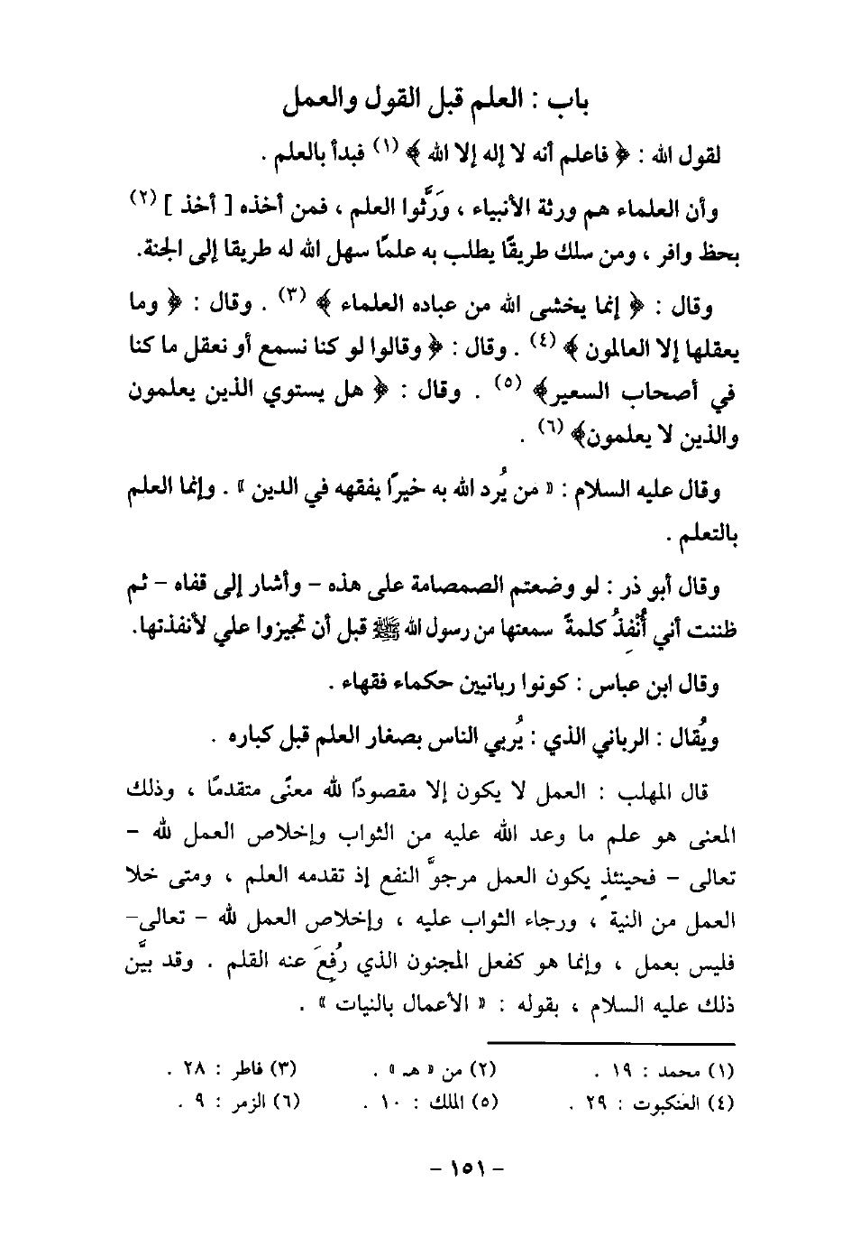 لِقَوْلِ اللَّهِ: (فَاعْلَمْ أَنَّهُ لا إِلَهَ إِلا اللَّهُ) [محمد: 19] فَبَدَأَ بِالْعِلْمِ وَأَنَّ الْعُلَمَاءَ هُمْ وَرَثَةُ الأنْبِيَاءِ، وَرَّثُوا الْعِلْمَ، فَمَنْ أَخَذَهُ أَخَذَ بِحَظٍّ وَافِرٍ، وَمَنْ سَلَكَ طَرِيقًا يَطْلُبُ بِهِ عِلْمًا سَهَّلَ اللَّهُ لَهُ طَرِيقًا إِلَى الْجَنَّةِ. وَقَالَ: (إِنَّمَا يَخْشَى اللَّهَ مِنْ عِبَادِهِ الْعُلَمَاءُ) [فاطر: 28] وَقَالَ: (وَمَا يَعْقِلُهَا إِلا الْعَالِمُونَ) [العنكبوت: 43] ) وَقَالُوا لَوْ كُنَّا نَسْمَعُ أَوْ نَعْقِلُ مَا كُنَّا فِى أَصْحَابِ السَّعِيرِ) [الملك: 10] وَقَالَ: (هَلْ يَسْتَوِى الَّذِينَ يَعْلَمُونَ وَالَّذِينَ لا يَعْلَمُونَ) [الزمر: 9] . وَقَالَ (صلى الله عليه وسلم) : تمت مَنْ يُرِدِ اللَّهُ بِهِ خَيْرًا يُفَقِّهْهُ فِى الدِّينِ -، وَإِنَّمَا الْعِلْمُ بِالتَّعَلُّمِ. وَقَالَ أَبُو ذَرٍّ: لَوْ وَضَعْتُمُ الصَّمْصَامَةَ عَلَى هَذِهِ - وَأَشَارَ إِلَى قَفَاهُ - ثُمَّ ظَنَنْتُ أَنِّى أُنْفِذُ كَلِمَةً سَمِعْتُهَا مِنَ رسول اللَّه (صلى الله عليه وسلم) قَبْلَ أَنْ تُجِيزُوا عَلَىَّ لأنْفَذْتُهَا. وَقَالَ ابْنُ عَبَّاسٍ: (كُونُوا رَبَّانِيِّينَ) [آل عمران: 79] حُلَمَاءَ فُقَهَاءَ. وَيُقَالُ: الرَّبَّانِىُّ الَّذِى يُرَبِّى النَّاسَ بِصِغَارِ الْعِلْمِ قَبْلَ كِبَارِهِ. قال المهلب: العمل لا يكون إلا مقصودًا لله معنًى متقدمًا، وذلك المعنى هو علم ما وعد الله عليه من الثواب وإخلاص العمل لله تعالى، فحينئذٍ يكون العمل مرجوَّ النفع إذ تقدمه العلم، ومتى خلا العمل من النية، ورجاء الثواب عليه، وإخلاص العمل لله تعالى، فليس بعمل، وإنما هو كفعل المجنون الذى رُفِعَ عنه القلم. وقد بيَّن ذلك (صلى الله عليه وسلم) ، بقوله: تمت الأعمال بالنيات -.