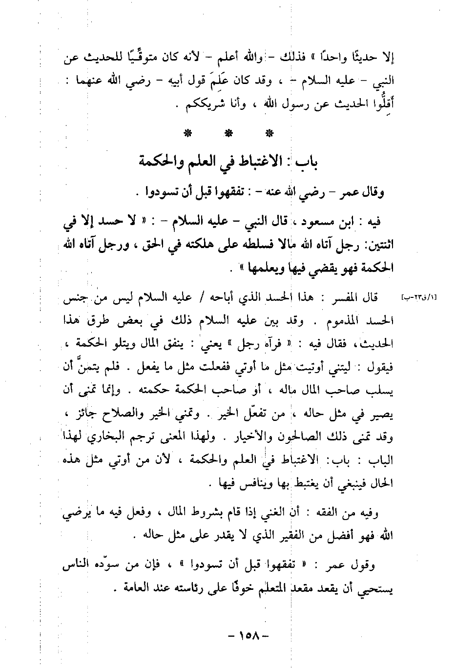 وَقَالَ عُمَرُ، رضِى اللَّه عنه: تَفَقَّهُوا قَبْلَ أَنْ تُسَوَّدُوا / 15 - فيه: ابن مَسْعُودٍ، قَالَ النَّبِىُّ (صلى الله عليه وسلم) : تمت لا حَسَدَ إِلا فِى اثْنَتَيْنِ: رَجُلٌ آتَاهُ اللَّهُ مَالاً فَسَلَّطَهُ عَلَى هَلَكَتِهِ فِى الْحَقِّ، وَرَجُلٌ آتَاهُ اللَّهُ الْحِكْمَةَ، فَهُوَ يَقْضِى بِهَا وَيُعَلِّمُهَا -. قال المفسر: هذا الحسد الذى أباحه (صلى الله عليه وسلم) ليس من جنس الحسد المذموم، وقد بين (صلى الله عليه وسلم) ذلك فى بعض طرق هذا الحديث، فقال فيه: تمت فرآه رجل - يعنى ينفق المال ويتلو الحكمة، فيقول: ليتنى أوتيت مثل ما أوتى ففعلت مثل ما يفعل، فلم يتمنَّ أن يسلب صاحب المال ماله، أو صاحب الحكمة حكمته، وإنما تمنى أن يصير فى مثل حاله، من تفعّل الخير، وتمنى الخير والصلاح جائز وقد تمنى ذلك الصالحون والأخيار، ولهذا المعنى ترجم البخارى لهذا الباب باب الاغتباط فى العلم والحكمة، لأن من أوتى مثل هذه الحال فينبغى أن يغتبط بها وينافس فيها. وفيه من الفقه أن الغنى إذا قام بشروط المال، وفعل فيه ما يرضى الله، فهو أفضل من الفقير الذى لا يقدر على مثل حاله. وقول عمر: تمت تفقهوا قبل أن تسودوا -، فإن من سوده الناس يستحيى أن يقعد مقعد المتعلم خوفًا على رئاسته عند العامة.