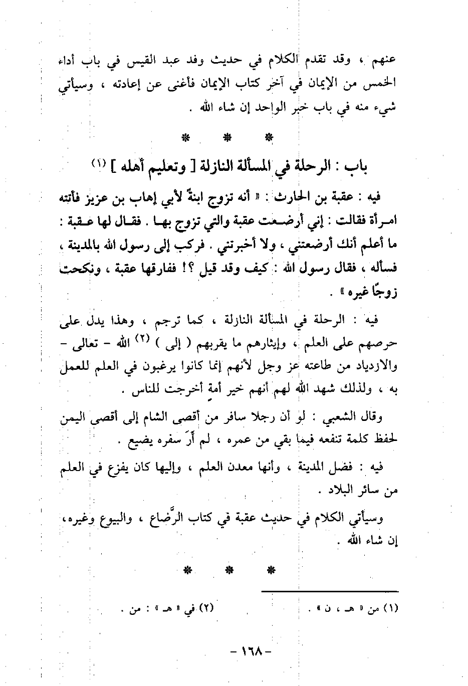 - باب الرِّحْلَةِ فِى الْمَسْأَلَةِ النَّازِلَةِ، وَتَعْلِيمِ أَهْلِهِ