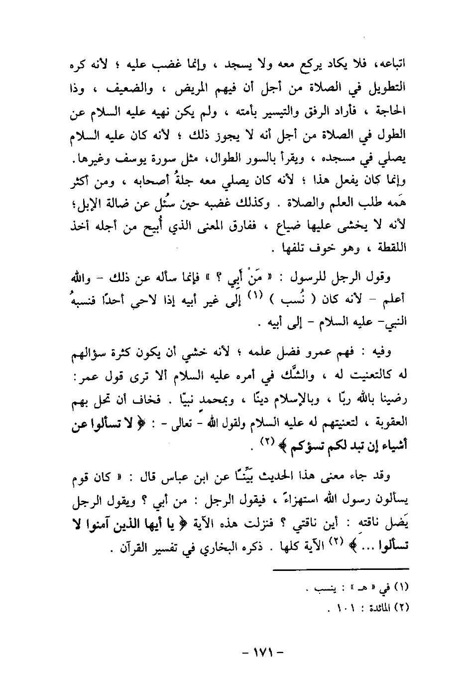 اتباعه، فلا يكاد يركع معه ولا يسجد، وإنما غضب عليه، لأنه كره التطويل فى الصلاة من أجل أن فيهم المريض، والضعيف وذا الحاجة، فأراد الرفق والتيسير بأمته، ولم يكن نهيه (صلى الله عليه وسلم) عن الطول فى الصلاة من أجل أنه لا يجوز ذلك، لأنه كان (صلى الله عليه وسلم) يصلى فى مسجده، ويقرأ بالسور الطوال، مثل سورة يوسف وغيرها، وإنما كان يفعل هذا، لأنه كان يصلى معه جلةُ أصحابه، ومن أكثر همه طلب العلم والصلاة، وكذلك غضبه حين سُئل عن ضالة الإبل، لأنه لا يخشى عليها ضياع، ففارق المعنى الذى أُبيح من أجله أخذ اللقطة، وهو خوف تلفها. وقول الرجل للرسول: تمت مَنْ أَبِى -؟ فإنما سأله عن ذلك، والله أعلم، لأنه كان نُسب إلى غير أبيه إذا لاحى أحدًا فنسبه النبى، (صلى الله عليه وسلم) ، إلى أبيه. وفيه: فهم عمر وفضل علمه، لأنه خشى أن يكون كثرة سؤالهم له كالتعنيت له، والشَّك فى أمره (صلى الله عليه وسلم) ألا ترى قول عمر: رضينا بالله ربًا، وبالإسلام دينًا، وبمحمد نبيًا، فخاف أن تحل بهم العقوبة، لتعنيتهم له (صلى الله عليه وسلم) ولقول الله تعالى: (لاَ تَسْأَلُواْ عَنْ أَشْيَاء إِن تُبْدَ لَكُمْ تَسُؤْكُمْ) [المائدة: 101] . وقد جاء معنى هذا الحديث بَيِّنًا عن ابن عباس، قال: تمت كان قوم يسألون رسول الله (صلى الله عليه وسلم) استهزاءً، فيقول الرجل: من أبى؟ ويقول الرجل يَضل ناقته: أين ناقتى؟ فنزلت هذه الآية: (يَا أَيُّهَا الَّذِينَ آمَنُواْ لاَ تَسْأَلُواْ (الآية كلها، ذكره البخارى فى تفسير القرآن.