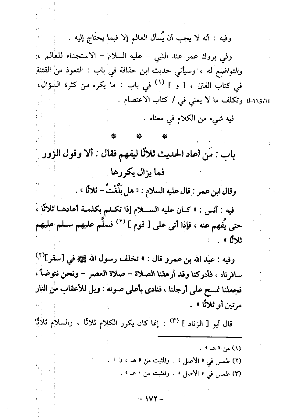 وَقَالَ ابْنُ عُمَرَ: قَالَ (صلى الله عليه وسلم) : تمت هَلْ بَلَّغْتُ -، ثَلاثًا. / 33 - فيه: أَنَس، كَانَ (صلى الله عليه وسلم) ، إِذَا تَكَلَّمَ بِكَلِمَةٍ أَعَادَهَا ثَلاثًا، حَتَّى يُفْهَمَ عَنْهُ، فَإِذَا أَتَى عَلَى قَوْمٍ فَسَلَّمَ عَلَيْهِمْ، سَلَّمَ عَلَيْهِمْ ثَلاثًا. / 34 - وفيه: عَبْدِاللَّهِ بْنِ عَمْرٍو، قَالَ: تَخَلَّفَ رَسُولُ اللَّهِ (صلى الله عليه وسلم) فِى سَفَرٍ سَافَرْنَاهُ، فَأَدْرَكَنَا، وَقَدْ أَرْهَقْنَا الصَّلاةَ، صَلاةَ الْعَصْرِ، وَنَحْنُ نَتَوَضَّأُ، فَجَعَلْنَا نَمْسَحُ عَلَى أَرْجُلِنَا، فَنَادَى بِأَعْلَى صَوْتِهِ: تمت وَيْلٌ لِلأعْقَابِ مِنَ النَّارِ -، مَرَّتَيْنِ، أَوْ ثَلاثًا. قال أبو الزناد: إنما كان يكرر الكلام ثلاثًا، والسلام ثلاثًا
