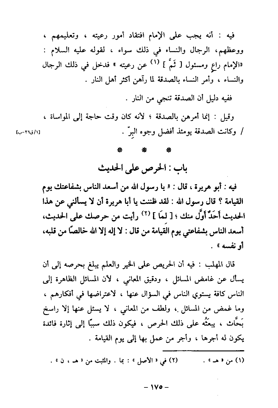 / 37 - فيه: أَبُو هُرَيْرَةَ، قَالَ: يَا رَسُولَ اللَّهِ، مَنْ أَسْعَدُ النَّاسِ بِشَفَاعَتِكَ يَوْمَ الْقِيَامَةِ؟ قَالَ رَسُولُ اللَّهِ (صلى الله عليه وسلم) : تمت لَقَدْ ظَنَنْتُ يَا أَبَا هُرَيْرَةَ أَنْ لا يَسْأَلُنِى عَنْ هَذَا الْحَدِيثِ أَحَدٌ أَوَّلُ مِنْكَ، لِمَا رَأَيْتُ مِنْ حِرْصِكَ عَلَى الْحَدِيثِ، أَسْعَدُ النَّاسِ بِشَفَاعَتِى يَوْمَ الْقِيَامَةِ، مَنْ قَالَ لا إِلَهَ إِلا اللَّهُ خَالِصًا مِنْ قَلْبِهِ أَوْ نَفْسِهِ -. قال المهلب: فيه أن الحريص على الخير والعلم يبلغ بحرصه إلى أن يسأل عن غامض المسائل، ودقيق المعانى، لأن المسائل الظاهرة إلى الناس كافة يستوى الناس فى السؤال عنها، لاعتراضها فى أفكارهم، وما غمض من المسائل، ولطف من المعانى، لا يسئل عنها إلا راسخ بَحَّاث، يبعَثُه على ذلك الحرص، فيكون ذلك سببًا إلى إثارة فائدة يكون له أجرها، وأجر من عمل بها إلى يوم القيامة.