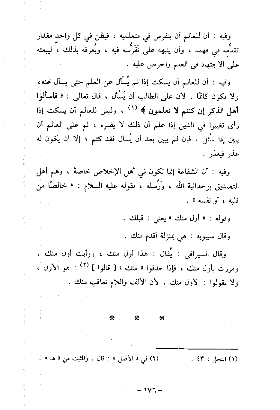 وفيه: أن للعالم أن يتفرس فى متعلميه، فيظن فى كل واحد مقدار تقدمه فى فهمه، وأن ينبهه على تفرسه فيه، ويعرفه ذلك، ليبعثه على الاجتهاد فى العلم والحرص عليه. وفيه: أن للعالم أن يسكت إذا لم يسأل عن العلم حتى يسأل عنه، ولا يكون كاتمًا، لأن على الطالب أن يسأل، قال تعالى: (فَاسْأَلُواْ أَهْلَ الذِّكْرِ إِن كُنتُمْ لاَ تَعْلَمُونَ) [النحل: 43] ، وليس للعالم أن يسكت إذا رأى تغييرا فى الدين إذا علم أن ذلك لا يضره، ثم على العالم أن يبين إذا سئل، فإن لم يبين بعد أن يسأل فقد كتم، إلا أن يكون له عذر فيعذر. وفيه: أن الشفاعة إنما تكون فى أهل الإخلاص خاصة، وهم أهل التصديق بوحدانية الله، ورسله، لقوله (صلى الله عليه وسلم) : تمت خالصًا من قلبه، أو نفسه -. وقوله: تمت أول منك - يعنى قبلك. وقال سيبويه: هى بمنزلة أقدم منك. وقال السيرافى: يقال: هذا أول منك، ورأيت أول منك، ومررت بأول منك، فإذا حذفوا تمت منك - قالوا: هو الأول، ولا يقولوا: الأول منك، لأن الألف واللام تعاقب منك.