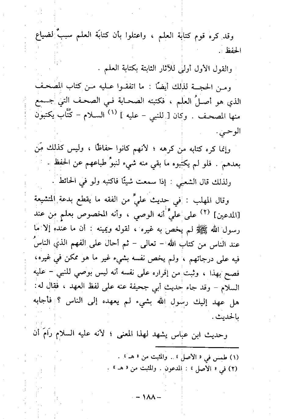 وقد كره قوم كتابة العلم، واعتلوا بأن كتابة العلم سبب لضياع الحفظ. والقول الأول أولى للآثار الثابته بكتابة العلم. ومن الحجة لذلك أيضًا ما اتفقوا عليه من كتاب المصحف الذى هو أصل العلم، فكتبته الصحابة فى الصحف التى جمع منها المصحف، وكان للنبى، (صلى الله عليه وسلم) ، كُتَّاب يكتبون الوحى. وإنما كره كتابه من كرهه، لأنهم كانوا حفاظًا، وليس كذلك من بعدهم، فلو لم يكتبوه ما بقى منه شىء لنبوِّ طباعهم عن الحفظ، ولذلك قال الشعبى: إذا سمعت شيئًا فاكتبه ولو فى الحائط. وقال المهلب: فى حديث علىِّ من الفقه ما يقطع بدعة المتشيعة المدعين على علىِّ أنه الوصى، وأنه المخصوص بعلم من عند رسول الله (صلى الله عليه وسلم) لم يخص به غيره، لقوله ويمينه: أن ما عنده إلا ما عند الناس من كتاب الله تعالى، ثم أحل على الفهم الذى الناس فيه على درجاتهم، ولم يخص نفسه بشىء غير ما هو ممكن فى غيره فصح بهذا وثبت من إقراره على نفسه أنه ليس بوصى للنبى (صلى الله عليه وسلم) ، وقد جاء حديث أبى جحفة عند على لفظ العهد، فقال له: هل عهد إليك رسول الله بشىء لم يعهده إلى الناس؟ فأجابه بالحديث. وحديث ابن عباس يشهد لهذا المعنى، لأنه (صلى الله عليه وسلم) رَامَ أن