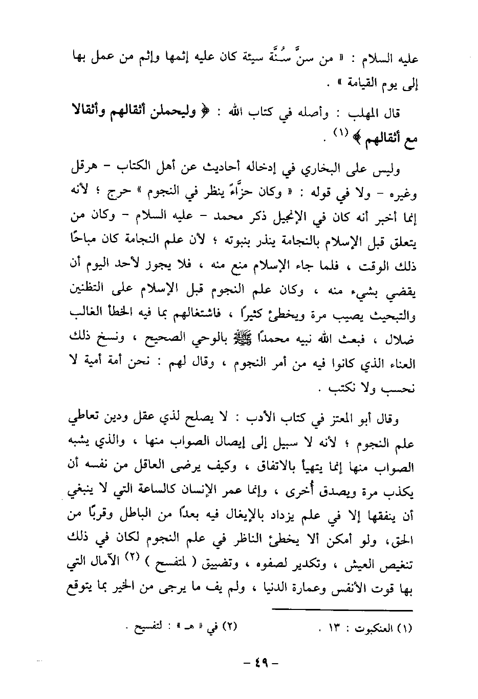 (صلى الله عليه وسلم) : تمت من سنَّ سُنَّة سيئة كان عليه إثمها وإثم من عمل بها إلى يوم القيامة -. قال المهلب: وأصله فى كتاب الله: (وَلَيَحْمِلُنَّ أَثْقَالَهُمْ وَأَثْقَالاً مَّعَ أَثْقَالِهِمْ) [العنكبوت: 13] . وليس على البخارى فى إدخاله أحاديث عن أهل الكتاب، هرقل وغيره، ولا فى قوله: تمت وكان حزَّاءً ينظر فى النجوم - حرج؛ لأنه إنما أخبر أنه كان فى الإنجيل ذكر محمد، (صلى الله عليه وسلم) ، وكان من يتعلق قبل الإسلام بالنجامة ينذر بنبوته؛ لأن علم النجامة كان مباحًا ذلك الوقت، فلما جاء الإسلام منع منه، فلا يجوز لأحد اليوم أن يقضى بشىء منه، وكان علم النجوم قبل الإسلام على التظنين والتبحيث يصيب مرة ويخطئ كثيرًا، فاشتغالهم بما فيه الخطأ الغالب ضلال، فبعث الله نبيه محمدًا (صلى الله عليه وسلم) بالوحى الصحيح، ونسخ ذلك العناء الذى كانوا فيه من أمر النجوم، وقال لهم: نحن أمة أمية لا نحسب ولا نكتب. وقال أبو المعتز فى كتاب الأدب: لا يصلح لذى عقل ودين تعاطى علم النجوم؛ لأنه لا سبيل إلى إيصال الصواب منها، والذى يشبه الصواب منها إنما يتهيأ بالاتفاق، وكيف يرضى العاقل من نفسه أن يكذب مرة ويصدق أخرى، وإنما عمر الإنسان كالساعة التى لا ينبغى أن ينفقها إلا فى علم يزداد بالإيغال فيه بعدًا من الباطل وقربًا من الحق، ولو أمكن ألا يخطئ الناظر فى علم النجوم لكان فى ذلك تنغيص العيش، وتكدير لصفوه، وتضييق لمتفسح الآمال التى بها قوت الأنفس وعمارة الدنيا، ولم يف ما يرجى من الخير بما يتوقع