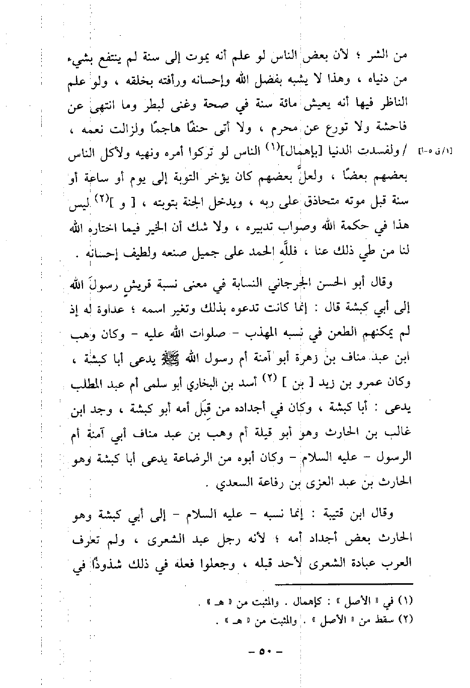 من الشر؛ لأن بعض الناس لو علم أنه يموت إلى سنة لم ينتفع بشىء من دنياه، وهذا لا يشبه بفضل الله وإحسانه ورأفته بخلقه، ولو علم الناظر فيها أنه يعيش مائة سنة فى صحة وغنى لبطر وما انتهى عن فاحشة ولا تورع عن محرم، ولا أتى حنقًا هاجمًا ولزالت نعمه، ولفسدت الدنيا بإهمال الناس لو تركوا أمره ونهيه ولأكل الناس بعضهم بعضًا، ولعل بعضهم كان يؤخر التوبة إلى يوم أو ساعة أو سنة قبل موته متحاذق على ربه، ويدخل الجنة بتوبته، وليس هذا فى حكمة الله وصواب تدبيره، ولا شك أن الخير فيما اختاره الله لنا من طى ذلك عنا، فلله الحمد على جميل صنعه ولطيف إحسانه. وقال أبو الحسن الجرجانى النسابة فى معنى نسبة قريشٍ رسول الله إلى أبى كبشة قال: إنما كانت تدعوه بذلك وتغير اسمه؛ عداوة له إذ لم يمكنهم الطعن فى نسبه المهذب، صلوات الله عليه، وكان وهب بن عبد مناف بن زهرة أبو آمنة أم رسول الله (صلى الله عليه وسلم) يدعى: أبا كبشة، وكان عمرو بن زيد بن أسد بن البخارى أبو سلمى أم عبد المطلب يدعى: أبا كبشة، وكان فى أجداده من قِبَل أمه أبو كبشة، وجد ابن غالب بن الحارث وهو أبو قيلة أم وهب بن عبد مناف أبى آمنة أم الرسول، (صلى الله عليه وسلم) ، وكان أبوه من الرضاعة يدعى: أبا كبشة وهو الحارث بن عبد العزى بن رفاعة السعدى. وقال ابن قتيبة: إنما نسبه، (صلى الله عليه وسلم) ، إلى أبى كبشة وهو الحارث بعض أجداد أمه؛ لأنه رجل عبد الشعرى، ولم تعرف العرب عبادة الشعرى لأحد قبله، وجعلوا فعله فى ذلك شذوذًا فى
