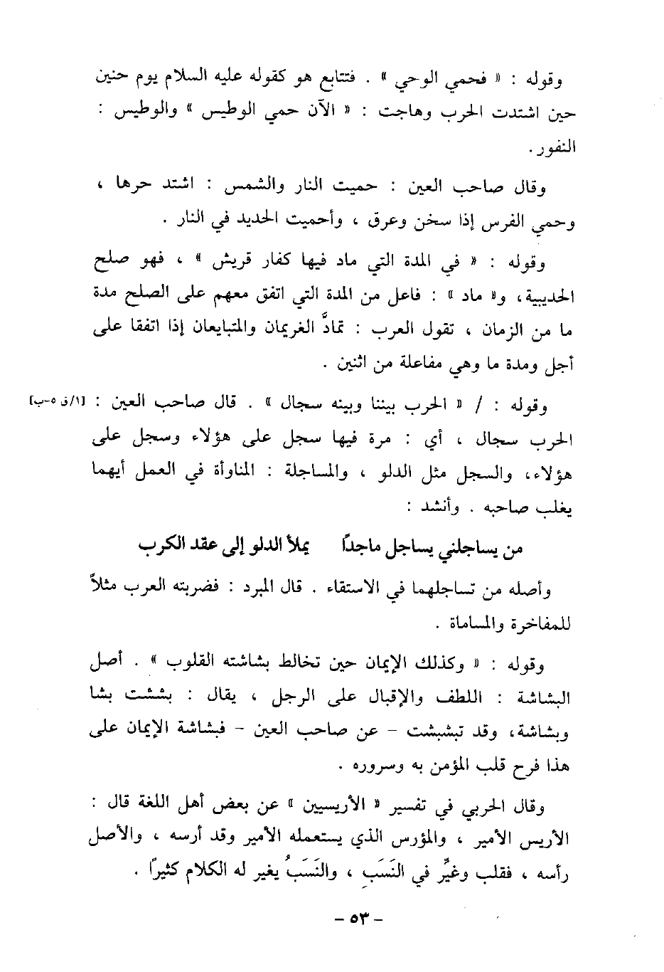 وقوله: تمت فحمى الوحى - فتتابع هو، كقوله (صلى الله عليه وسلم) يوم حنين حين اشتدت الحرب وهاجت: تمت الآن حمى الوطيس - والوطيس: النفور. وقال صاحب العين: حميت النار والشمس: اشتد حرها وحمى الفرس إذا سخن وعرق، وأحميت الحديد فى النار. وقوله: تمت فى المدة التى ماد فيها كفار قريش - فهو صلح الحديبية، وتمت ماد -: فاعل من المدة التى اتفق معهم على الصلح مدة ما من الزمان، تقول العرب: تماد الغريمان والمتبايعان إذا اتفقا على أجل ومدة وهى مفاعلة من اثنين. وقوله: تمت الحرب بيننا وبينه سجال -، قال صاحب العين: الحرب سجال، أى: مرة فيها سجل على هؤلاء وسجل على هؤلاء، والسجل مثل الدلو، والمساجلة: المناوأة فى العمل أيهما يغلب صاحبه. وأنشد: من يساجلنى يساجل ماجدًا يملأ الدلو إلى عقد الكرب وأصله من تساجلهما فى الاستقاء. قال المبرد: فضربته العرب مثلا للمفاخرة والمساماة. وقوله: تمت وكذلك الإيمان حين تخالط بشاشته القلوب -، أصل البشاشة: اللطف والإقبال على الرجل، يقال: بششت بشا وبشاشة، وقد تبشبشت، عن صاحب العين، فبشاشة الإيمان على هذا فرح قلب المؤمن به وسروره. وقال الحربى فى تفسير تمت الأريسيين - عن بعض أهل اللغة قال: الأريس الأمير، والمؤرس الذى يستعمله الأمير وقد أرسه، والأصل رأسه، فقلب وغير فى النَسَبٍ، والنَسَبُ يغير له الكلام كثيرًا.