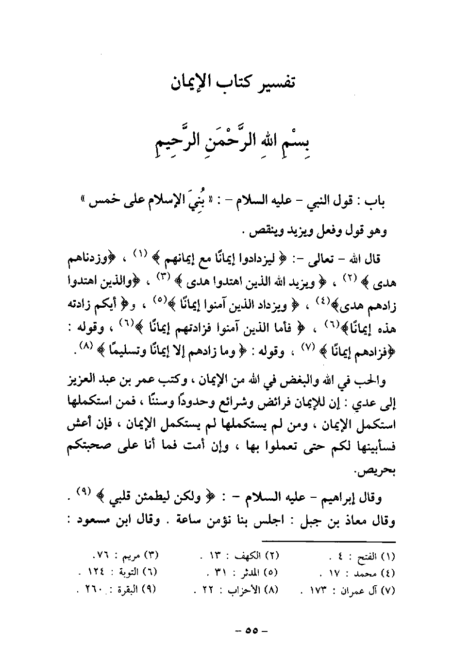 وَهُوَ قَوْلٌ وَفِعْلٌ، وَيَزِيدُ وَيَنْقُصُ، قَالَ اللَّهُ تَعَالَى: (لِيَزْدَادُوا إِيمَانًا مَعَ إِيمَانِهِمْ) [الفتح: 4] ،) وَزِدْنَاهُمْ هُدًى) [الكهف: 13] ،) وَيَزِيدُ اللَّهُ الَّذِينَ اهْتَدَوْا هُدًى) [مريم: 76] ،) وَالَّذِينَ اهْتَدَوْا زَادَهُمْ هُدًى) [محمد: 17] ،) وَيَزْدَادَ الَّذِينَ آمَنُوا إِيمَانًا) [المدثر: 31] ،) أَيُّكُمْ زَادَتْهُ هَذِهِ إِيمَانا) [التوبة: 124] ) فَأَمَّا الَّذِينَ آمَنُوا فَزَادَتْهُمْ إِيمَانًا) [التوبة: 124] وَقَوْلُهُ: (فَزَادَهُمْ إِيمَانًا) [آل عمران: 173] وَقَوْلُهُ: (وَمَا زَادَهُمْ إِلا إِيمَانًا وَتَسْلِيمًا) [الأحزاب: 22] وَالْحُبُّ فِى اللَّهِ وَالْبُغْضُ فِى اللَّهِ مِنَ الإيمَانِ. وَكَتَبَ عُمَرُ بْنُ عَبْدِالْعَزِيزِ إِلَى عَدِيِّ: إِنَّ لِلإيمَانِ فَرَائِضَ وَشَرَائِعَ وَحُدُودًا وَسُنَنًا، فَمَنِ اسْتَكْمَلَهَا اسْتَكْمَلَ الإيمَانَ، وَمَنْ لَمْ يَسْتَكْمِلْهَا لَمْ يَسْتَكْمِلِ الإيمَانَ، فَإِنْ أَعِشْ فَسَأُبَيِّنُهَا لَكُمْ حَتَّى تَعْمَلُوا بِهَا، وَإِنْ أَمُتْ فَمَا أَنَا عَلَى صُحْبَتِكُمْ بِحَرِيصٍ. وَقَالَ إِبْرَاهِيمُ، (صلى الله عليه وسلم) : (وَلَكِنْ لِيَطْمَئِنَّ قَلْبِى) [البقرة: 260] . وَقَالَ مُعَاذُ بْنُ جَبَلٍ: اجْلِسْ بِنَا نُؤْمِنْ سَاعَةً. وَقَالَ ابْنُ مَسْعُودٍ: