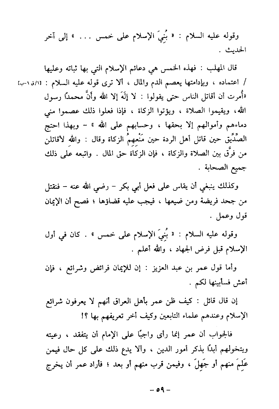 قال المهلب: فهذه الخمس هى دعائم الإسلام التى بها ثباته، وعليها اعتماده، وبإدامتها يعصم الدم والمال، ألا ترى قوله (صلى الله عليه وسلم) : تمت أُمرت أن أقاتل الناس حتى يقولوا: لا إله إلا الله وأنَّ محمدًا رسول الله، ويقيموا الصلاة، ويؤتوا الزكاة، فإذا فعلوا ذلك عصموا منى دماءهم وأموالهم إلا بحقها، وحسابهم على الله -، وبهذا احتج الصِّدِّيق حين قاتل أهل الردة حين مَنْعِهِمُ الزكاة، وقال: واللهِ لأقاتلن من فرَّق بين الصلاة والزكاة، فإن الزكاة حق المال، واتبعه على ذلك جميع الصحابة. وكذلك ينبغى أن يقاس على فعل أبى بكر، رضى الله عنه، فنقتل من جحد فريضة ومن ضيعها، فيجب عليه قضاؤها، فصح أن الإيمان قول وعمل. وقوله (صلى الله عليه وسلم) : تمت بُنِىَ الإسلام على خمس -، كان فى أول الإسلام قبل فرض الجهاد، والله أعلم. وأما قول عمر بن عبد العزيز: إن للإيمان فرائض وشرائع، فإن أعش فسأبينها لكم. إن قال قائل: كيف ظن عمر بأهل العراق أنهم لا يعرفون شرائع الإسلام وعندهم علماء التابعين وكيف أخر تعريفهم بها؟ . فالجواب: أن عمر إنما رأى واجبًا على الإمام أن يتفقد، رعيته ويتخولهم أبدًا بذكر أمور الدين، وألا يدع ذلك على كل حال فيمن عَلِمَ منهم أو جَهِلَ، وفيمن قرب منهم أو بعد، فأراد عمر أن يخرج