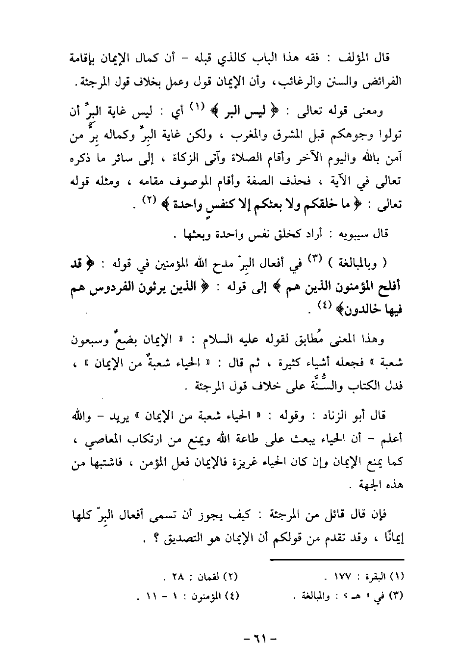 قال المؤلف: فقه هذا الباب كالذى قبله، أن كمال الإيمان بإقامة الفرائض والسنن والرغائب، وأن الإيمان قول وعمل بخلاف قول المرجئة. ومعنى قوله تعالى: (لَّيْسَ الْبِرَّ) [البقرة: 177] أى: ليس غاية البرِّ أن تولوا وجوهكم قبل المشرق والمغرب، ولكن غاية البرِّ وكماله بِرُّ من آمن بالله واليوم الآخر وأقام الصلاة، وآتى الزكاة، إلى سائر ما ذكره تعالى فى الآية، فحذف الصفة وأقام الموصوف مقامه، ومثله قوله تعالى: (مَّا خَلْقُكُمْ وَلاَ بَعْثُكُمْ إِلاَّ كَنَفْسٍ وَاحِدَةٍ) [لقمان: 28] . قال سيبويه: أراد كخلق نفس واحدة وبعثها. وبالمبالغة فى أفعال البر مدح الله المؤمنين فى قوله: (قَدْ أَفْلَحَ الْمُؤْمِنُونَ الَّذِينَ هُمْ (إلى قوله: (الَّذِينَ يَرِثُونَ الْفِرْدَوْسَ هُمْ فِيهَا خَالِدُونَ) [المؤمنون: 1 - 11] . وهذا المعنى مُطابق لقوله (صلى الله عليه وسلم) : تمت الإيمان بضعٌ وسبعون شعبة -، فجعله أشياء كثيرة، ثم قال: تمت الحياء شعبةٌ من الإيمان -، فدل الكتاب والسُّنَّة على خلاف قول المرجئة. قال أبو الزناد: وقوله: تمت الحياء شعبة من الإيمان - يريد، والله أعلم، أن الحياء يبعث على طاعة الله ويمنع من ارتكاب المعاصى، كما يمنع الإيمان، وإن كان الحياء غريزة فالإيمان فعل المؤمن، فاشتبها من هذه الجهة. فإن قال قائل من المرجئة: كيف يجوز أن تسمى أفعال البرِّ كلها إيمانًا، وقد تقدم من قولكم أن الإيمان هو التصديق؟ .
