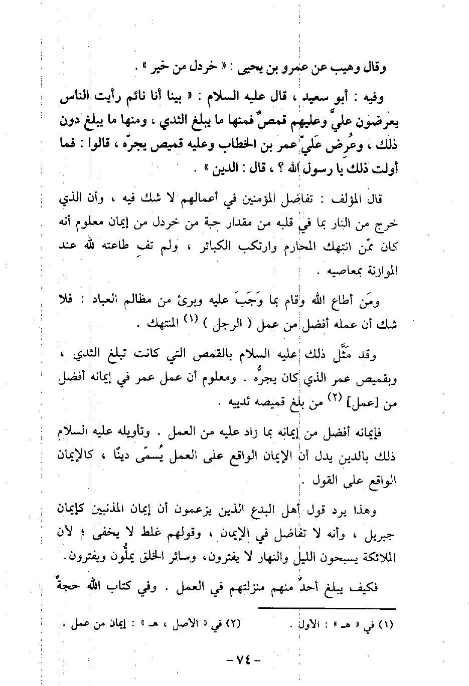 وَقَالَ وُهَيْبٌ، عَنْ عَمْرِو بْنِ يَحْيَى: تمت خَرْدَلٍ مِنْ خَيْرٍ -. / 15 - وفيه: أبو سَعِيدٍ الْخُدْرِىَّ، قَالَ (صلى الله عليه وسلم) : تمت بَيْنَا أَنَا نَائِمٌ رَأَيْتُ النَّاسَ يُعْرَضُونَ عَلَىَّ، وَعَلَيْهِمْ قُمُصٌ: فَمِنْهَا مَا يَبْلُغُ الثُّدِىَّ، وَمِنْهَا مَا دُونَ ذَلِكَ، وَعُرِضَ عَلَىَّ عُمَرُ بْنُ الْخَطَّابِ وَعَلَيْهِ قَمِيصٌ يَجُرُّهُ -، قَالُوا: فَمَا أَوَّلْتَ ذَلِكَ يَا رَسُولَ اللَّهِ؟ قَالَ: تمت الدِّينَ -. قال المؤلف: تفاضل المؤمنين فى أعمالهم لا شك فيه، وأن الذى خرج من النار بما فى قلبه من مقدار حبة من خردل من إيمان معلوم أنه كان ممن انتهك المحارم وارتكب الكبائر، ولم تفِ طاعته لله عند الموازنة بمعاصيه. ومن أطاع الله وقام بما وَجَبَ عليه وبرئ من مظالم العباد فلا شك أن عمله أفضل من عمل الرجل المنتهك. وقد مَثَّل ذلك (صلى الله عليه وسلم) بالقمص التى كانت تبلغ الثدى، وبقميص عمر الذى كان يجرُّه، ومعلوم أن عمل عمر فى إيمانه أفضل من عمل من بلغ قميصه ثدييه. فإيمانه أفضل من إيمانه بما زاد عليه من العمل، وتأويله (صلى الله عليه وسلم) ذلك بالدين يدل أن الإيمان الواقع على العمل يُسمى دينًا، كالإيمان الواقع على القول. وهذا يرد قول أهل البدع الذين يزعمون أن إيمان المذنبين كإيمان جبريل، وأنه لا تفاضل فى الإيمان، وقولهم غلط لا يخفى، لأن الملائكة يسبحون الليل والنهار لا يفترون، وسائر الخلق يملُّون ويفترون. فكيف يبلغ أحدٌ منهم منزلتهم فى العمل، وفى كتاب الله حجةٌ