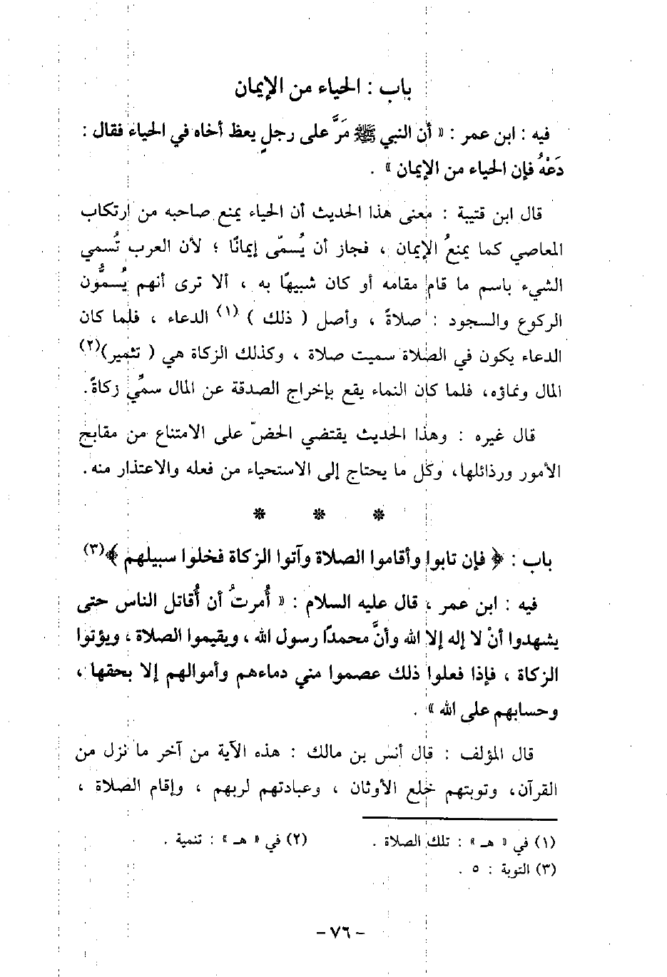 / 17 - فيه: ابْنِ عُمَرَ، قَالَ (صلى الله عليه وسلم) : تمت أُمِرْتُ أَنْ أُقَاتِلَ النَّاسَ حَتَّى يَشْهَدُوا أَنْ لا إِلَهَ إِلا اللَّهُ وَأَنَّ مُحَمَّدًا رَسُولُ اللَّهِ، وَيُقِيمُوا الصَّلاةَ، وَيُؤْتُوا الزَّكَاةَ، فَإِذَا فَعَلُوا ذَلِكَ عَصَمُوا مِنِّى دِمَاءَهُمْ وَأَمْوَالَهُمْ إِلا بِحَقِّها، وَحِسَابُهُمْ عَلَى اللَّهِ -. قال المؤلف: قال أنس بن مالك: هذه الآية من آخر ما نزل من القرآن، وتوبتهم خلع الأوثان، وعبادتهم لربهم، وإقام الصلاة،