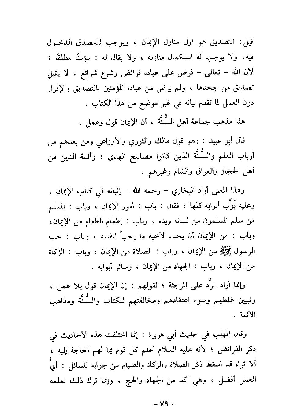 قيل: التصديق هو أول منازل الإيمان، ويوجب للمصدق الدخول فيه، ولا يوجب له استكمال منازله، ولا يقال له: مؤمنًا مطلقًا، لأن الله تعالى فرض على عباده فرائض وشرع شرائع، لا يقبل تصديق من جحدها، ولم يرض من عباده المؤمنين بالتصديق والإقرار دون العمل لما تقدم بيانه فى غير موضع من هذا الكتاب. هذا مذهب جماعة أهل السُّنَّة، أن الإيمان قول وعمل. قال أبو عبيد: وهو قول مالك والثورى والأوزاعى ومن بعدهم من أرباب العلم والسُّنَّة الذين كانوا مصابيح الهدى، وأئمة الدين من أهل الحجاز والعراق والشام وغيرهم. وهذا المعنى أراد البخارى، رحمه الله، إثباته فى كتاب الإيمان وعليه بَوَّب أبوابه كلها، فقال: باب أمور الإيمان، وباب المسلم من سلم المسلمون من لسانه ويده، وباب إطعام الطعام من الإيمان، وباب من الإيمان أن يحب لأخيه ما يحب لنفسه، وباب حب الرسول (صلى الله عليه وسلم) من الإيمان، وباب الصلاة من الإيمان، وباب الزكاة من الإيمان، وباب الجهاد من الإيمان وسائر أبوابه. وإنما أراد الرَّد على المرجئة، لقولهم: إن الإيمان قول بلا عمل، وتبيين غلطهم وسوء اعتقادهم ومخالفتهم للكتاب والسُّنَّة، ومذهب الأئمة. وقال المهلب فى حديث أبى هريرة: إنما اختلفت هذه الأحاديث فى ذكر الفرائض، لأنه (صلى الله عليه وسلم) أعلم كل قوم بما لهم الحاجة إليه، ألا تراه قد أسقط ذكر الصلاة والزكاة والصيام من جوابه للسائل: أى العمل أفضل، وهى آكد من الجهاد والحج، وإنما ترك ذلك لعلمه