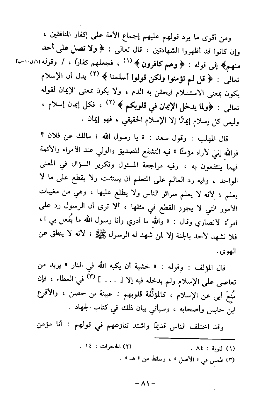 ومن أقوى ما يرد عليهم إجماع الأمة على إكفار المنافقين، وإن كانوا قد أظهروا الشهادتين، قال تعالى: (وَلاَ تُصَلِّ عَلَى أَحَدٍ مِّنْهُم (إلى قوله: (وَهُمْ كَافِرُونَ) [التوبة: 84] ، فجعلهم كفارًا، وقوله تعالى: (قُلْ لَمْ تُؤْمِنُوا وَلَكِنْ قُولُوا أَسْلَمْنَا (يدل على أن الإسلام يكون بمعنى الاستسلام فيحقن به الدم، ولا يكون بمعنى الإيمان لقوله تعالى: (وَلَمَّا يَدْخُلِ الإِيمَانُ فِى قُلُوبِكُمْ) [الحجرات: 14] ، فكل إيمان إسلام، وليس كل إسلام إيمانًا، إلا الإسلام الحقيقى، فهو إيمان. قال المهلب: وقول سعد: تمت يا رسول الله، مالك عن فلان؟ فوالله إنى لأراه مؤمنًا - فيه التشفع للصديق والولى عند الأمراء والأئمة فيما ينتفعون به، وفيه مراجعة المسئول وتكرير السؤال فى المعنى الواحد، وفيه رد العالم على المتعلم أن يستثبت ولا يقطع على ما لا يعلم، لأنه لا يعلم سرائر الناس ولا يطلع عليها، وهى من مغيبات الأمور التى لا يجوز القطع فى مثلها، ألا ترى أن الرسول رد على امرأة الأنصارى، وقال: تمت والله ما أدرى وأنا رسول الله ما يُفعل بى -، فلا نشهد لأحد بالجنة إلا لمن شهد له الرسول (صلى الله عليه وسلم) ، لأنه لا ينطق عن الهوى. قال المؤلف: وقوله: تمت خشية أن يكبه الله فى النار -، يريد من تعاصى على الإسلام ولم يدخل فيه إلا [. . . . . .] (-) فى العطاء، فإن مُنِعَ أبى عن الإسلام، كالمؤلفة قلوبهم: عيينة بن حصن، والأقرع بن حابس وأصحابه، وسيأتى بيان ذلك فى كتاب الجهاد. وقد اختلف الناس قديمًا واشتد تنازعهم فى قولهم: أنا مؤمن
