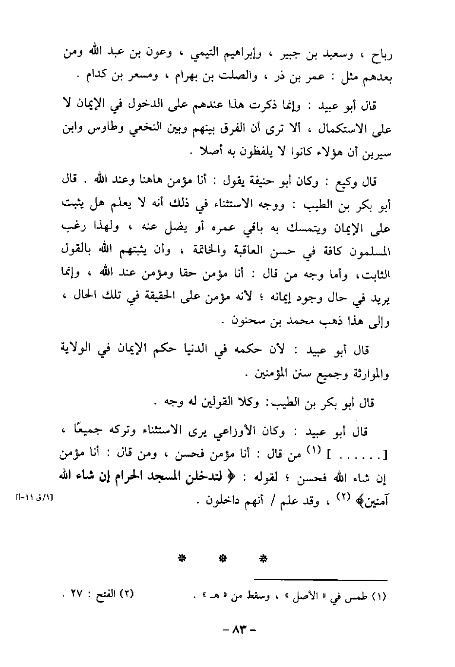 رباح، وسعيد بن جبير، وإبراهيم التيمى، وعون بن عبد الله، ومن بعدهم مثل: عمر بن ذر، والصلت بن بهرام، ومسعر بن كدام. قال أبو عبيد: وإنما ذكرت هذا عندهم على الدخول فى الإيمان لا على الاستكمال، ألا ترى أن الفرق بينهم وبين النخعى وطاوس وابن سيرين أن هؤلاء كانوا لا يلفظون به أصلاً. قال وكيع: وكان أبو حنيفة يقول: أنا مؤمن هاهنا وعند الله، قال أبو بكر بن الطيب: ووجه الاستثناء فى ذلك أنه لا يعلم هل يثبت على الإيمان ويتمسك به باقى عمره أو يضل عنه، ولهذا رغب المسلمون كافة فى حسن العاقبة والخاتمة، وأن يثبتهم الله بالقول الثابت، وأما وجه من قال: أنا مؤمن حقًا ومؤمن عند الله، وإنما يريد حال وجود إيمانه، لأنه مؤمن على الحقيقة فى تلك الحال، وإلى هذا ذهب محمد بن سحنون. قال أبو عبيد: لأن حكمه فى الدنيا حكم الإيمان فى الولاية والموارثة وجميع سنن المؤمنين. قال أبو بكر بن الطيب: وكلا القولين له وجه. قال أبو عبيد: وكان الأوزاعى يرى الاستثناء وتركه جميعًا [. . . . .] ، من قال: أنا مؤمن فحسن، ومن قال: أنا مؤمن، إن شاء الله فحسن، لقوله: (لَتَدْخُلُنَّ الْمَسْجِدَ الْحَرَامَ إِن شَاء اللَّهُ آمِنِينَ) [الفتح: 27] ، وقد علم أنهم داخلون.