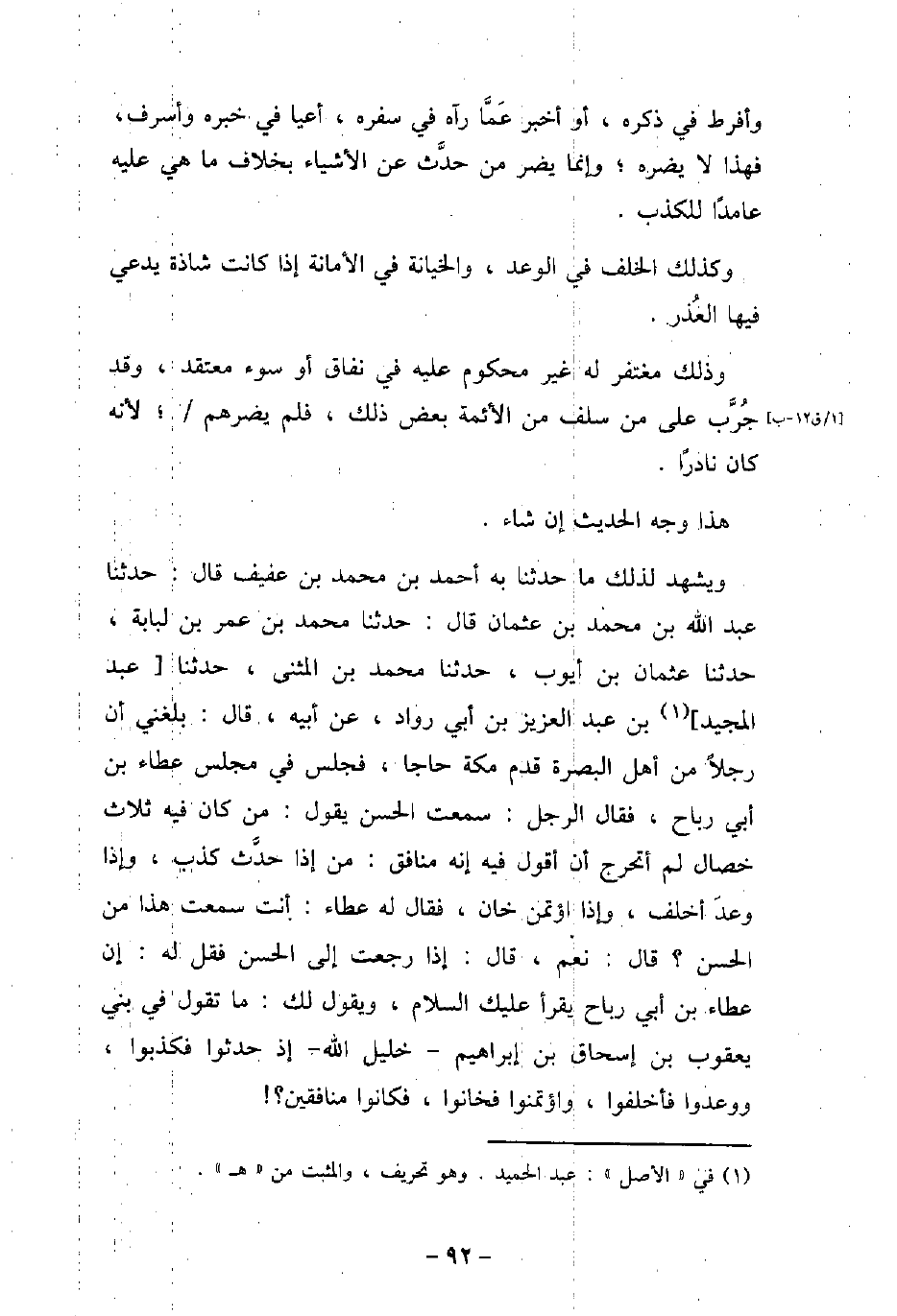 وأفرط فى ذكره، أو أخبر عَمَّا رآه فى سفره، أعيا فى خبره وأسرف، فهذا لا يضره، وإنما يضر من حدَّث عن الأشياء بخلاف ما هى عليه عامدًا للكذب. وكذلك الخلف فى الوعد، والخيانة فى الأمانة إذا كانت شاذة يدعى فيها العُذر. وذلك مغتفر له غير محكوم عليه فى انفاق أو سوء معتقد، وقد جُرَّب على من سلف من الأئمة بعض ذلك، فلم يضرهم، لأنه كان نادرًا. هذا وجه الحديث إن شاء الله. ويشهد لذلك ما حدثنا به أحمد بن محمد بن عفيف، قال: حدثنا عبد الله بن محمد بن عثمان، قال: حدثنا محمد بن عمر بن لبابة، حدثنا عثمان بن أيوب، حدثنا محمد بن المثنى، حدثنا عبد المجيد بن عبد العزيز بن أبى رواد، عن أبيه، قال: بلغنى أن رجلاً من أهل البصرة قدم مكة حاجًا، فجلس فى مجلس عطاء بن أبى رباح، فقال الرجل: سمعت الحسن يقول: من كان فيه ثلاث خصال لم أتحرج أن أقول فيه إنه منافق: من إذا حدَّث كذب، وإذا وعد أخلف، وإذا أؤتمن خان، فقال له عطاء: أنت سمعت هذا من الحسن؟ قال: نعم، قال: إذا رجعت إلى الحسن، فقل له: إن عطاء بن أبى رباح يقرأ عليك السلام، ويقول لك: ما تقول فى بنى يعقوب بن إسحاق بن إبراهيم، خليل الله، إذ حدثوا فكذبوا، ووعدوا فاخلفوا، وأؤتمنوا فخانوا، فكانوا منافقين؟ .