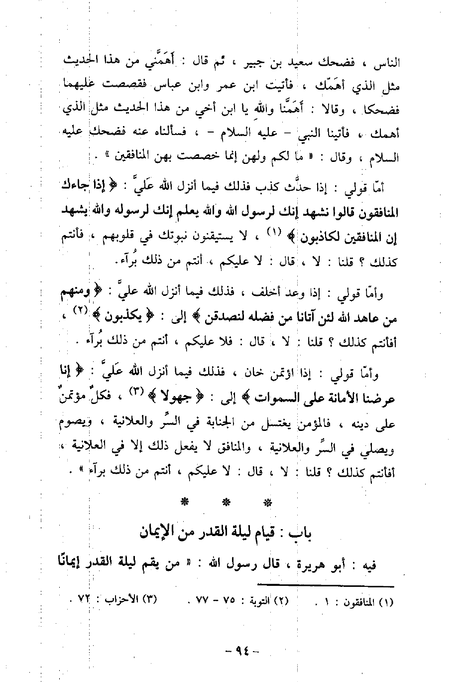 الناس، فضحك سعيد بن جبير، ثم قال: أَهَمَّنِى من هذا الحديث مثل الذى أهمك، فأتيت ابن عمر وابن عباس فقصصت عليهما فضحكا، وقالا: أهمنا والله يا ابن أخى من هذا الحديث مثل الذى أهمك، فأتينا النبى، (صلى الله عليه وسلم) ، فسألناه عنه فضحك (صلى الله عليه وسلم) ، وقال: تمت ما لكم ولهن إنما خصصت بهن المنافقين. أما قولى: إذا حدث كذب فذلك فيما أنزل الله عَلىَّ: (إِذَا جَاءكَ الْمُنَافِقُونَ قَالُوا نَشْهَدُ إِنَّكَ لَرَسُولُ اللَّهِ وَاللَّهُ يَعْلَمُ إِنَّكَ لَرَسُولُهُ وَاللَّهُ يَشْهَدُ إِنَّ الْمُنَافِقِينَ لَكَاذِبُونَ (، [المنافقون: 1] لا يستيقنون نبوتك فى قلوبهم، فأنتم كذلك؟ قلنا: لا، قال: لا عليكم، أنتم من ذلك برآء. أما قولى: إذا وعد أخلف، فذلك فيما أنزل الله علىَّ: (وَمِنْهُم مَّنْ عَاهَدَ اللهَ لَئِنْ آتَانَا مِن فَضْلِهِ لَنَصَّدَّقَنَّ (، إلى: (يَكْذِبُونَ) [التوبة: 75 - 77] ، أفأنتم كذلك؟ قلنا: لا، قال: فلا عليكم، أنتم من ذلك برآء. أما قولى: إذا اؤتمن خان، فذلك فيما أنزل الله عَلىَّ: (إِنَّا عَرَضْنَا الأَمَانَةَ عَلَى السَّمَاوَاتِ (إلى: (جَهُولاً) [الأحزاب: 72] ، فكل مؤتمن على دينه، فالمؤمن يغتسل من الجنابة فى السر والعلانية، ويصوم ويصلى فى السر والعلانية، والمنافق لا يفعل ذلك إلا فى العلانية، أفأنتم كذلك؟ قلنا: لا، قال: لا عليكم، أنتم من ذلك برآء -.