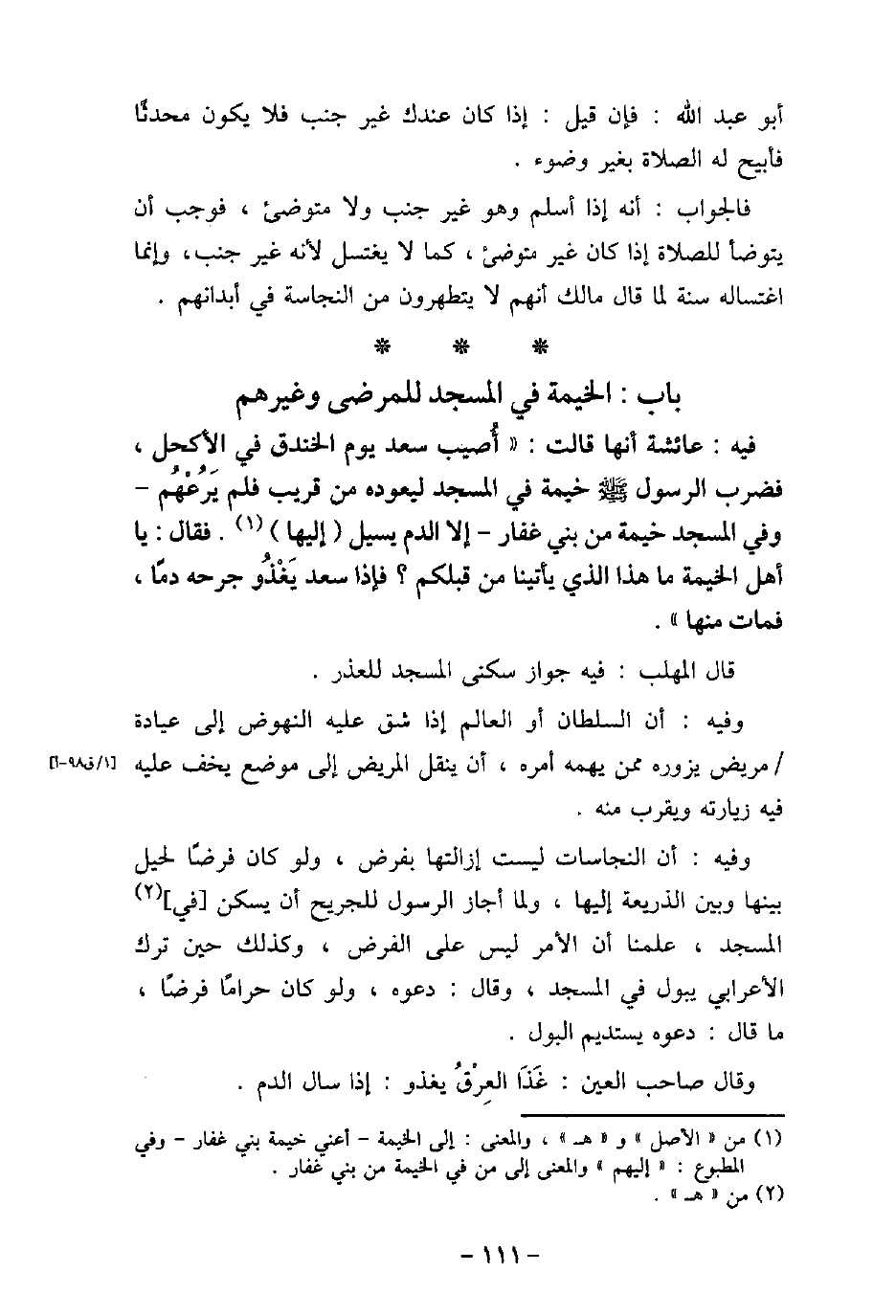 / 92 - فيه: عَائِشَةَ قَالَتْ: (أُصِيبَ سَعْدٌ يَوْمَ الْخَنْدَقِ فِي الأكْحَلِ، فَضَرَبَ الرسول (صلى الله عليه وسلم) خَيْمَةً فِي الْمَسْجِدِ، لِيَعُودَهُ مِنْ قَرِيبٍ، فَلَمْ يَرُعْهُمْ، وَفِي الْمَسْجِدِ خَيْمَةٌ مِنْ بَنِي غِفَارٍ، إِلا الدَّمُ يَسِيلُ إِلَيْهِا، فَقَال: يَا أَهْلَ الْخَيْمَةِ، مَا هَذَا الَّذِي يَأْتِينَا مِنْ قِبَلِكُمْ؟) فَإِذَا سَعْدٌ يَغْذُو جُرْحُهُ دَمًا، فَمَاتَ منهَا. قال المهلب: فيه جواز سكنى المسجد للعذر. وفيه: أن السلطان أو العالم إذا شق عليه النهوض إلى عيادة مريض يزوره ممن يهمه أمره، أن ينقل المريض إلى الموضع يخف عليه فيه زيارته ويقرب منه. وفيه: أن النجاسات ليست إزالتها بفرض، ولو كان فرضًا لحيل بينها وبين الذريعة إليها، ولما أجاز الرسول للجريح أن يسكن فى المسجد، علمنا أن الأمر ليس على الفرض، وكذلك حين ترك الأعرابى يبول فى المسجد، وقال: دعوه، ولو كان حرامًا فرضًا، ما قال: دعوه يستديم البول. وقال صاحب (العين) : غَذَا العِرْقُ يغذو: إذا سال الدم.