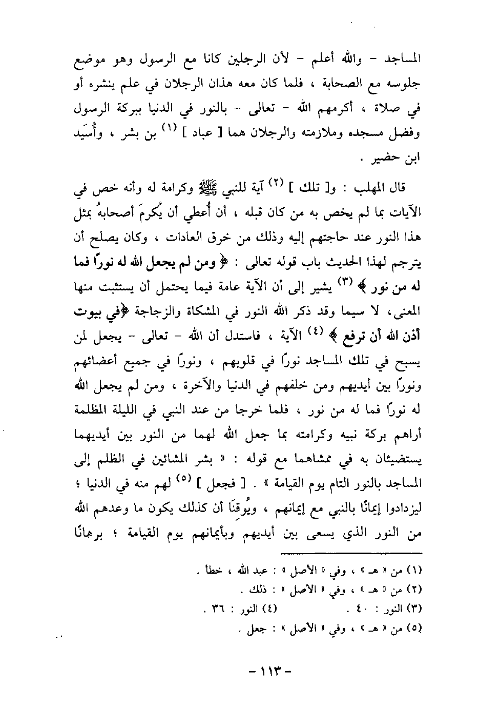المساجد، والله أعلم؛ لأن الرجلين كانا مع الرسول وهو موضع جلوسه مع الصحابة، فلما كان معه هذان الرجلان فى علم ينشره أو فى صلاة، أكرمهم الله، تعالى، بالنور فى الدنيا ببركة الرسول وفضل مسجده وملازمته والرجلان هما عباد بن بشر، وأُسيد بن حضير. قال المهلب: وتلك آية للنبى (صلى الله عليه وسلم) وكرامة له، وأنه خص فى الآيات بما لم يخص به من كان قبله، أن أعطى أن يكرم أصحابه بمثل هذا النور عند حاجتهم إليه، وذلك من خرق العادات، وكان يصلح أن يترجم لهذا الحديث باب قوله تعالى: (ومن لم يجعل الله له نورًا فما له من نور) [النور: 40] ، يشير إلى أن الآية عامة فيما يحتمل أن يستثبت منها المعنى، لا سيما وقد ذكر الله النور فى المشكاة والزجاجة) فى بيوت أذن الله ترفع) [النور: 36] الآية، فاستدل أن الله تعالى، يجعل لمن يسبح فى تلك المساجد نورًا فى قلوبهم، ونورًا فى جميع أعضائهم ونورًا بين أيديهم ومن خلفهم فى الدنيا والآخرة، ومن لم يجعل الله له نورًا فما له من نور، فلما خرجا من عند النبى فى الليلة المظلمة أراهم بركة نبيه وكرامته بما جعل الله لهما من النور بين أيديهما يستضيئان به فى ممشاهما مع قوله: (بشر المشائين فى الظلم إلى المساجد بالنور التام يوم القيامة) ، فجعل لهم منه فى الدنيا، ليزدادوا إيمانًا بالنبى مع إيمانهم، ويُوقِنَا أن كذلك يكون ما وعدهم الله من النور الذى يسعى بين أيديهم وبأيمانهم يوم القيامة؛ برهانًا
