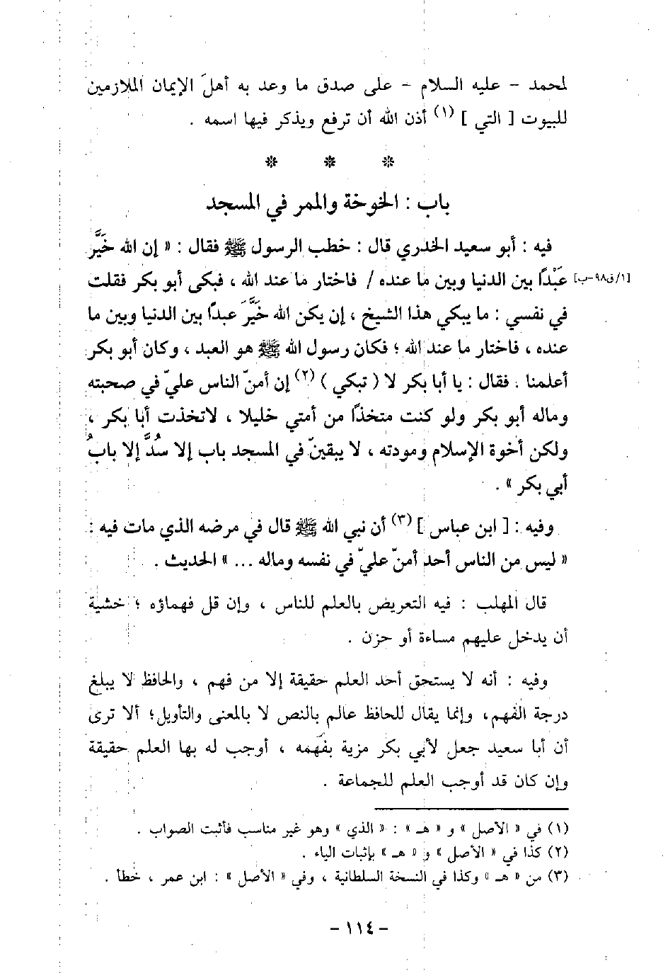 / 95 - فيه: أبو سعيد الخدرى قَالَ: خَطَبَ الرسول (صلى الله عليه وسلم) فَقَالَ: (إِنَّ اللَّهَ خَيَّرَ عَبْدًا بَيْنَ الدُّنْيَا وَبَيْنَ مَا عِنْدَهُ، فَاخْتَارَ مَا عِنْدَ اللَّهِ) ، فَبَكَى أَبُو بَكْرٍ الصِّدِّيقُ، فَقُلْتُ فِي نَفْسِي: مَا يُبْكِي هَذَا الشَّيْخَ؟ إِنْ يَكُنِ اللَّهُ خَيَّرَ عَبْدًا بَيْنَ الدُّنْيَا وَبَيْنَ مَا عِنْدَهُ، فَاخْتَارَ مَا عِنْدَ اللَّهِ، فَكَانَ رَسُولُ اللَّهِ (صلى الله عليه وسلم) هُوَ الْعَبْدَ، وَكَانَ أَبُو بَكْرٍ أَعْلَمَنَا، قَالَ: (يَا أَبَا بَكْرٍ لا تَبْكِى إِنَّ أَمَنَّ النَّاسِ عَلَيَّ فِي صُحْبَتِهِ وَمَالِهِ أَبُو بَكْرٍ، وَلَوْ كُنْتُ مُتَّخِذًا مِنْ أُمَّتِي خَلِيلاً، لاتَّخَذْتُ أَبَا بَكْرٍ، وَلَكِنْ أُخُوَّةُ الإسْلامِ وَمَوَدَّتُهُ، لا يَبْقَيَنَّ فِي الْمَسْجِدِ بَابٌ إِلا سُدَّ إِلا بَابُ أَبِي بَكْرٍ) . / 96 - وفيه: ابْنِ عَبَّاسٍ، أن نبى اللَّهِ (صلى الله عليه وسلم) قال فِي مَرَضِهِ الَّذِي مَاتَ فِيهِ: (لَيْسَ مِنَ النَّاسِ أَحَدٌ أَمَنَّ عَلَيَّ فِي نَفْسِهِ وَمَالِهِ. . .) الحديث. قال المهلب: فيه التعريض بالعلم للناس، وإن قل فهماؤه، خشية أن يدخل عليهم مساءة أو حزن. وفيه: أنه لا يستحق أحد العلم حقيقة إلا من فهم، والحافظ لا يبلغ درجة الفهم، وإنما يقال للحافظ عالم بالنص لا بالمعنى والتأويل؛ ألا ترى أن أبا سعيد جعل لأبى بكر مزية بفهمه، أوجب له بها العلم حقيقة وإن كان قد أوجب العلم للجماعة.