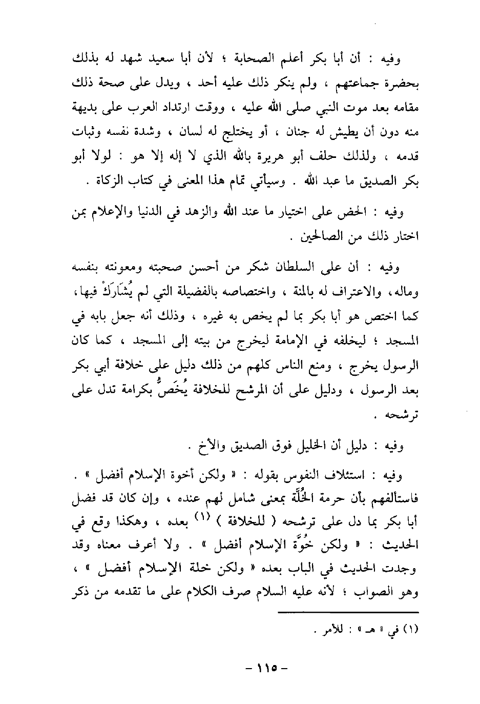 وفيه: أن أبا بكر أعلم الصحابة؛ لأن أبا سعيد شهد له بذلك بحضرة جماعتهم، ولم ينكر ذلك عليه أحد، ويدل على صحة ذلك مقامه بعد موت النبى (صلى الله عليه وسلم) ، ووقت ارتداد العرب على بديهة منه دون أن يطيش له جنان، أو يختلج له لسان، وشدة نفسه وثبات قدمه، ولذلك حلف أبو هريرة بالله الذى لا إله إلا هو: لولا أبو بكر الصديق ما عبد الله، وسيأتى تمام هذا المعنى فى كتاب الزكاة. وفيه: الحض على اختيار ما عند الله والزهد فى الدنيا والإعلام بمن اختار ذلك من الصالحين. وفيه: أن على السلطان شكر من أحسن صحبته ومعونته بنفسه وماله، والاعتراف له بالمنة، واختصاصه بالفضيلة التى لم يُشارك فيها، كما اختص هو أبا بكر بما لم يخص به غيره، وذلك أنه جعل بابه فى المسجد؛ ليخلفه فى الإمامة ليخرج من بيته إلى المسجد، كما كان الرسول يخرج، ومنع الناس كلهم من ذلك دليل على خلافة أبى بكر بعد الرسول، ودليل على أن المرشح للخلافة يُخصُّ بكرامة تدل على ترشحه. وفيه: دليل أن الخليل فوق الصديق والأخ. وفيه: استئلاف النفوس بقوله: (ولكن أخوة الإسلام أفضل) ، فاستألفهم بأن حرمة الخُلَّة بمعنى شامل لهم عنده، وإن كان قد فضل أبا بكر بما دل على ترشحه للخلافة بعده، وهكذا وقع فى الحديث: (ولكن خُوَّة الإسلام أفضل) ، ولا أعرف معناه وقد وجدت الحديث فى الباب بعده: (ولكن خلة الإسلام أفضل) ، وهو الصواب؛ لأنه عليه السلام، صرف الكلام على ما تقدمه من ذكر