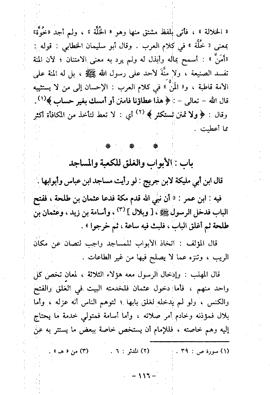 قال ابن أبى مليكة لابن جريج: لو رأيت مساجد ابن عباس وأبوابها. / 97 - فيه: ابن عمر: (أَنَّ نَّبِيَّ الله قَدِمَ مَكَّةَ، فَدَعَا عُثْمَانَ بْنَ طَلْحَةَ، فَفَتَحَ الْبَابَ، فَدَخَلَ الرسول (صلى الله عليه وسلم) ، وَبِلالٌ، وَأُسَامَةُ بْنُ زَيْدٍ، وَعُثْمَانُ بْنُ طَلْحَةَ، ثُمَّ أَغْلَقَ الْبَابَ، فَلَبِثَ فِيهِ سَاعَةً، ثُمَّ خَرَجُوا) . قال المؤلف: اتخاذ الأبواب للمساجد واجب لتصان عن مكان الريب، وتنزه عما لا يصلح فيها من غير الطاعات. قال المهلب: وإدخال الرسول معه هؤلاء الثلاثة، لمعانٍ تخص كل واحد منهم، فأما دخول عثمان فلخدمته البيت فى الغلق والفتح والكنس، ولو لم يدخله لغلق بابها؛ لتوهم الناس أنه عزله، وأما بلال فمؤذنه وخادم أمر صلاته، وأما أسامة فمتولى خدمة ما يحتاج إليه وهم خاصته؛ فللإمام أن يستخص خاصته ببعض ما يستتر به عن