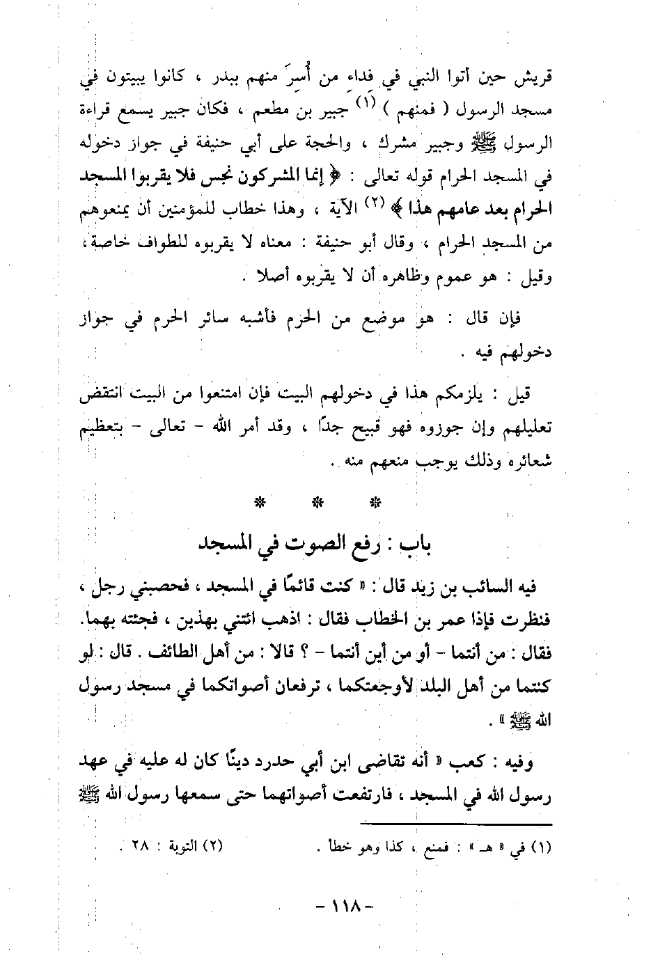 / 99 - فيه: السائب بم زيد قال: كُنْتُ قَائِمًا فِي الْمَسْجِدِ، فَحَصَبَنِي رَجُلٌ، فَنَظَرْتُ فَإِذَا عُمَرُ بْنُ الْخَطَّابِ، فَقَالَ: اذْهَبْ، ائتِنِي بِهَذَيْنِ، فَجِئْتُهُ بِهِمَا، فقَالَ: مَنْ أَنْتُمَا - أَوْ مِنْ أَيْنَ أَنْتُمَا؟ - قَالا: مِنْ أَهْلِ الطَّائِفِ، قَالَ: لَوْ كُنْتُمَا مِنْ أَهْلِ الْبَلَدِ، لأوْجَعْتُكُمَا، تَرْفَعَانِ أَصْوَاتَكُمَا فِي مَسْجِدِ رَسُولِ اللَّهِ (صلى الله عليه وسلم) . / 100 - وفيه: كَعْبِ: (أَنَّهُ تَقَاضَى ابْنَ أَبِي حَدْرَدٍ دَيْنًا لَهُ عَلَيْهِ فِي عَهْدِ رَسُولِ اللَّهِ فِي الْمَسْجِدِ، فَارْتَفَعَتْ أَصْوَاتُهُمَا، حَتَّى سَمِعَهَا رَسُولُ اللَّهِ (صلى الله عليه وسلم)