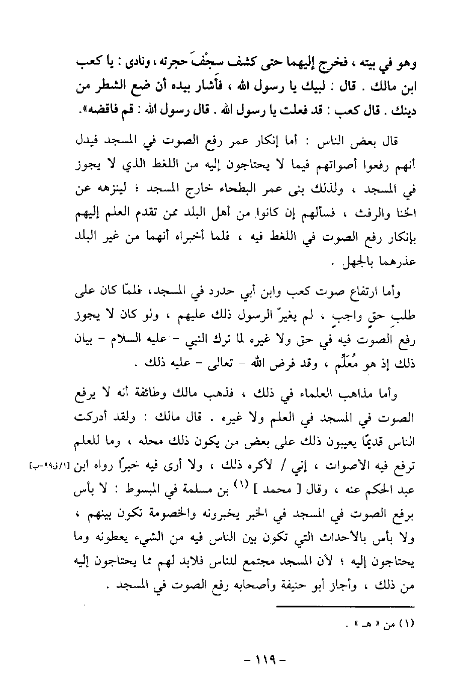 وَهُوَ فِي بَيْتِهِ، فَخَرَجَ إِلَيْهِمَا حَتَّى كَشَفَ سِجْفَ حُجْرَتِهِ، وَنَادَى: (يا كَعْبَ بْنَ مَالِكٍ) ، قَالَ: لَبَّيْكَ يَا رَسُولَ اللَّهِ، فَأَشَارَ بِيَدِهِ أَنْ ضَعِ الشَّطْرَ مِنْ دَيْنِكَ، قَالَ كَعْبٌ: قَدْ فَعَلْتُ يَا رَسُولَ اللَّهِ، قَالَ رَسُولُ اللَّهِ: قُمْ فَاقْضِهِ) . قال بعض الناس: أما إنكار عمر رفع الصوت فى المسجد، فيدل أنهم رفعوا أصواتهم فيما لا يحتاجون إليه من اللغط الذى لا يجوز فى المسجد، ولذلك بنى عمر البطحاء خارج المسجد؛ لينزهه عن الخنا والرفث، فسألهم إن كانوا من أهل البلد ممن تقدم العلم إليهم بإنكار رفع الصوت فى اللغط فيه، فلما أخبراه أنهما من غير البلد عذرهما بالجهل. وأما ارتفاع صوت كعب وابن أبى حدرد فى المسجد، فلما كان على طلب حقٍ واجبٍ، لم يغير الرسول ذلك عليهم، ولو كان لا يجوز رفع الصوت فيه فى حق ولا غيره لما ترك النبى، عليه السلام، بيان ذلك إذ هو مُعَلِّم، وقد فرض الله، تعالى، عليه ذلك. وأما مذاهب العلماء فى ذلك، فذهب مالك وطائفة أنه لا يرفع الصوت فى المسجد فى العلم ولا غيره، قال مالك: ولقد أدركت الناس قديمًا يعيبون ذلك على بعض من يكون ذلك محله، وما للعلم ترفع فيه الأصوات، إنى لأكره ذلك، ولا أرى فيه خيرًا رواه ابن عبد الحكم عنه، وقال محمد بن مسلمة فى المبسوط: لا بأس برفع الصوت فى المسجد فى الخبر يخبرونه والخصومة تكون بينهم، ولا بأس بالأحداث التى تكون بين الناس فيه من الشىء يعطونه، وما يحتاجون إليه؛ لأن المسجد مجتمع للناس فلابد لهم مما يحتاجون إليه من ذلك، وأجاز أبو حنيفة وأصحابه رفع الصوت فى المسجد.