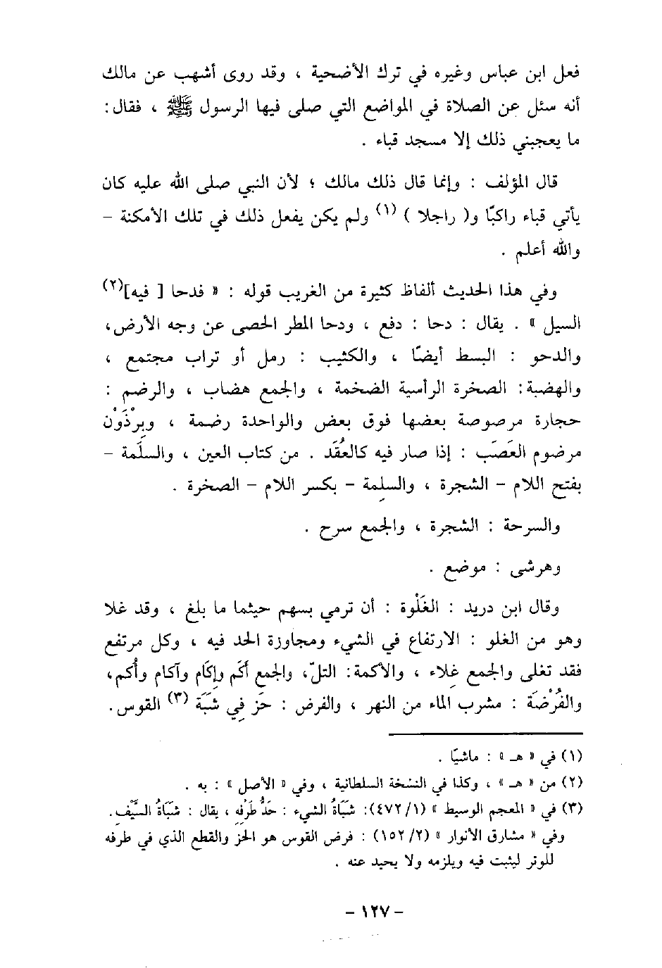 فعل ابن عباس وغيره فى ترك الأضحية، وقد روى أشهب عن مالك أنه سئل عن الصلاة فى المواضع التى صلى فيها الرسول (صلى الله عليه وسلم) ، فقال: ما يعجبنى ذلك إلا مسجد قباء. قال المؤلف: وإنما قال ذلك مالك؛ لأن النبى (صلى الله عليه وسلم) كان يأتى قباء راكبًا وراجلاً ولم يكن يفعل ذلك فى تلك الأمكنة، والله أعلم. وفى هذا الحديث ألفاظ كثيرة من الغريب قوله: (فدحا فيه السيل) ، يقال: دحا، دفع، ودحا المطر الحصى عن وجه الأرض، والدحو: البسط أيضًا، والكثيب: رمل أو تراب مجتمع، والهضبة: الصخرة الرأسية الضخمة، والجمع هضاب، والرضم: حجارة مرصوصة بعضها فوق بعض، والواحدة رضمة، وبِرْذَوْن مرضوم العَصَب: إذا صار فيه كالعُقَد، من كتاب العين، والسلَمة، بفتح اللام، الشجرة، والسلِمة، بكسر اللام، الصخرة. والسرحة: الشجرة، والجمع سرح. وهرشى: موضع. وقال ابن دريد: الغَلْوة: أن ترمى بسهم حيثما ما بلغ، وقد غلا وهو من الغلو: الارتفاع فى الشىء ومجاوزة الحد فيه، وكل مرتفع فقد تغلى والجمع غِلاء، والأكمة: التلّ، والجمع أَكَم، وإِكَام، وآكام، وأُكم، والفُرضْةَ: مشرب الماء من النهر، والفرض: حَز فِى شَبَة القوس.