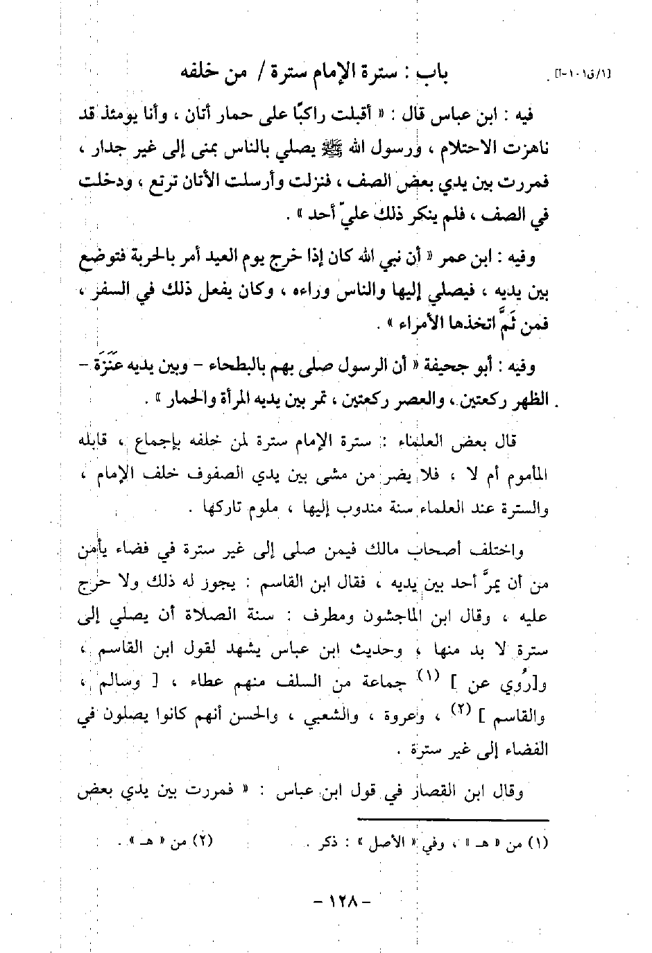 / 110 - فيه: ابن عباس قال: (أَقْبَلْتُ رَاكِبًا عَلَى حِمَارٍ أَتَانٍ، وَأَنَا يَوْمَئِذٍ قَدْ نَاهَزْتُ الاحْتِلامَ، وَرَسُولُ اللَّهِ (صلى الله عليه وسلم) يُصَلِّي بِالنَّاسِ بِمِنًى إِلَى غَيْرِ جِدَارٍ، فَمَرَرْتُ بَيْنَ يَدَيْ بَعْضِ الصَّفِّ، فَنَزَلْتُ، وَأَرْسَلْتُ الأتَانَ تَرْتَعُ، وَدَخَلْتُ فِي الصَّفِّ، فَلَمْ يُنْكِرْ ذَلِكَ عَلَيَّ أَحَدٌ) . / 111 - وفيه: ابن عمر: (أَنَّ نبى اللَّهِ كَانَ إِذَا خَرَجَ يَوْمَ الْعِيدِ أَمَرَ بِالْحَرْبَةِ، فَتُوضَعُ بَيْنَ يَدَيْهِ، فَيُصَلِّي إِلَيْهَا وَالنَّاسُ وَرَاءَهُ، وَكَانَ يَفْعَلُ ذَلِكَ فِي السَّفَرِ، فَمِنْ ثَمَّ اتَّخَذَهَا الأمَرَاءُ) . / 112 - وفيه: أبو جحيفة: (أَنَّ الرسول صَلَّى بِهِمْ بِالْبَطْحَاءِ، وَبَيْنَ يَدَيْهِ عَنَزَةٌ، الظُّهْرَ رَكْعَتَيْنِ، وَالْعَصْرَ رَكْعَتَيْنِ، تَمُرُّ بَيْنَ يَدَيْهِ الْمَرْأَةُ وَالْحِمَارُ) . قال بعض العلماء: سترة الإمام سترة لمن خلفه بإجماع، قابله المأموم أم لا، فلا يضر من مشى بين يدى الصفوف خلف الإمام، والسترة عند العلماء سنة مندوب إليها، ملوم تاركها. واختلف أصحاب مالك فيمن صلى إلى غير سترة فى فضاء يأمن من أن يمرَّ أحد بين يديه، فقال ابن القاسم: يجوز له ذلك ولا حرج عليه، وقال ابن الماجشون، ومطرف: سنة الصلاة أن يصلى إلى سترة لابد منها، وحديث ابن عباس يشهد لقول ابن القاسم، وروى عن جماعة من السلف منهم عطاء، وسالم، والقاسم، وعروة، والشعبى، والحسن أنهم كانوا يصلون فى الفضاء إلى غير سترة. وقال ابن القصار فى قول ابن عباس: (فمررت بين يدى بعض