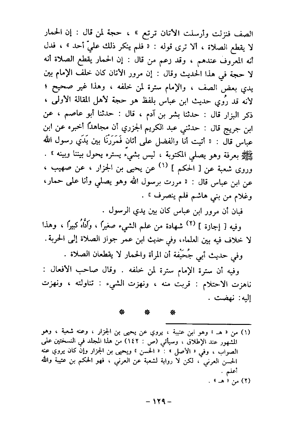الصف، فنزلت وأرسلت الأتان ترتع) ، حجة لمن قال: إن الحمار لا يقطع الصلاة، ألا ترى قوله: (فلم ينكر ذلك علىّ أحد) ، فدل أنه المعروف عندهم، وقد زعم من قال: إن الحمار يقطع الصلاة أنه لا حجة فى هذا الحديث، وقال: إن مرور الأتان كان خلف الإمام بين يدى بعض الصف، والإمام سترة لمن خلفه، وهذا غير صحيح؛ لأنه قد رُوى حديث ابن عباس بلفظ هو حجة لأهل المقالة الأولى، ذكر البزار، قال: حدثنا بشر بن آدم، قال: حدثنا أبو عاصم، عن ابن جريج قال: حدثنى عبد الكريم الجزرى أن مجاهدًا أخبره عن ابن عباس قال: (أتيت أنا والفضل على أتانٍ، فمررنا بين يدى رسول الله (صلى الله عليه وسلم) بعرفة، وهو يصلى المكتوبة، ليس بشىء يستره يحول بيننا وبينه) . وروى شعبة، عن الحكم، عن يحيى بن الجزار، عن صهيب، عن ابن عباس قال: (مررت برسول الله وهو يصلى، وأنا على حمار، وغلام من بنى هاشم فلم ينصرف) . فبان أن مرور ابن عباس كان بين يدى الرسول. وفيه: إجازة شهادة من علم الشىء صغيرًا، وأَدَّاهُ كبيرًا، وهذا لا خلاف فيه بين العلماء، وفى حديث ابن عمر جواز الصلاة إلى الحربة. وفى حديث أبى جُحَيفة: أن المرأة والحمار لا يقطعان الصلاة. وفيه: أن سترة الإمام سترة لمن خلفه، وقال صاحب الأفعال: ناهزت الاحتلام: قربت منه، ونهزت الشىء: تناولته، ونهزت إليه: نهضت.